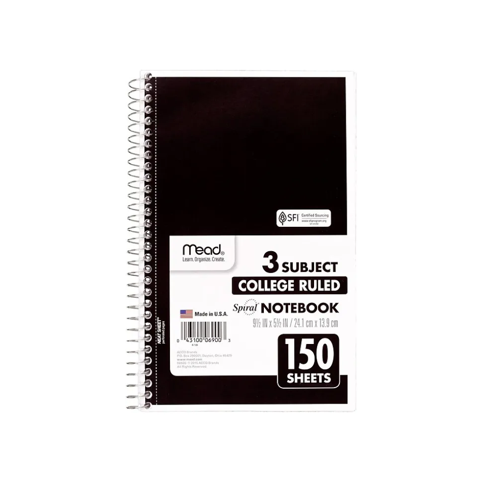 Keep information separated by category in this three-subject spiral notebook. The college-rule format and convenient margins keep writing neat and organized, while the white pages help ink and marker stand out. Each kraft divider in this book features a handy storage pocket for loose pages. A snag-resistant coil lets you flip through sheets for easy reference. This Mead Spiral notebook boasts a coated cover for enhanced durability.
