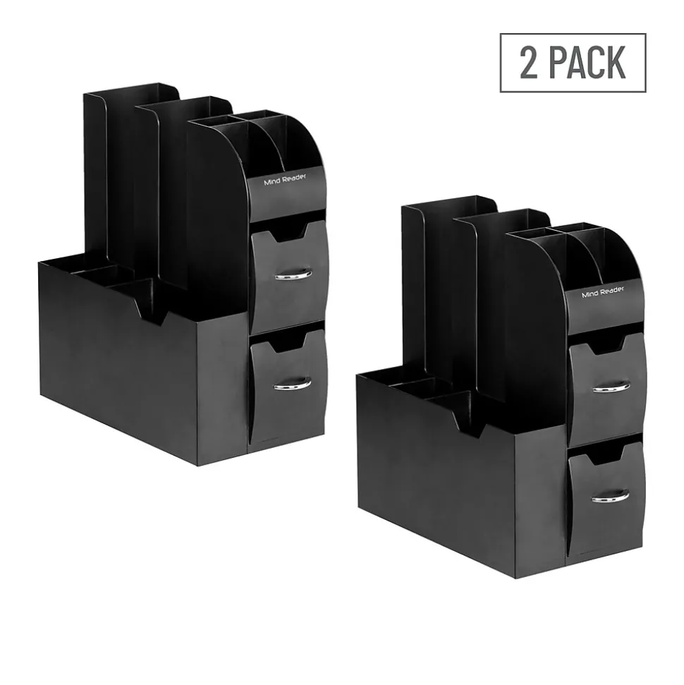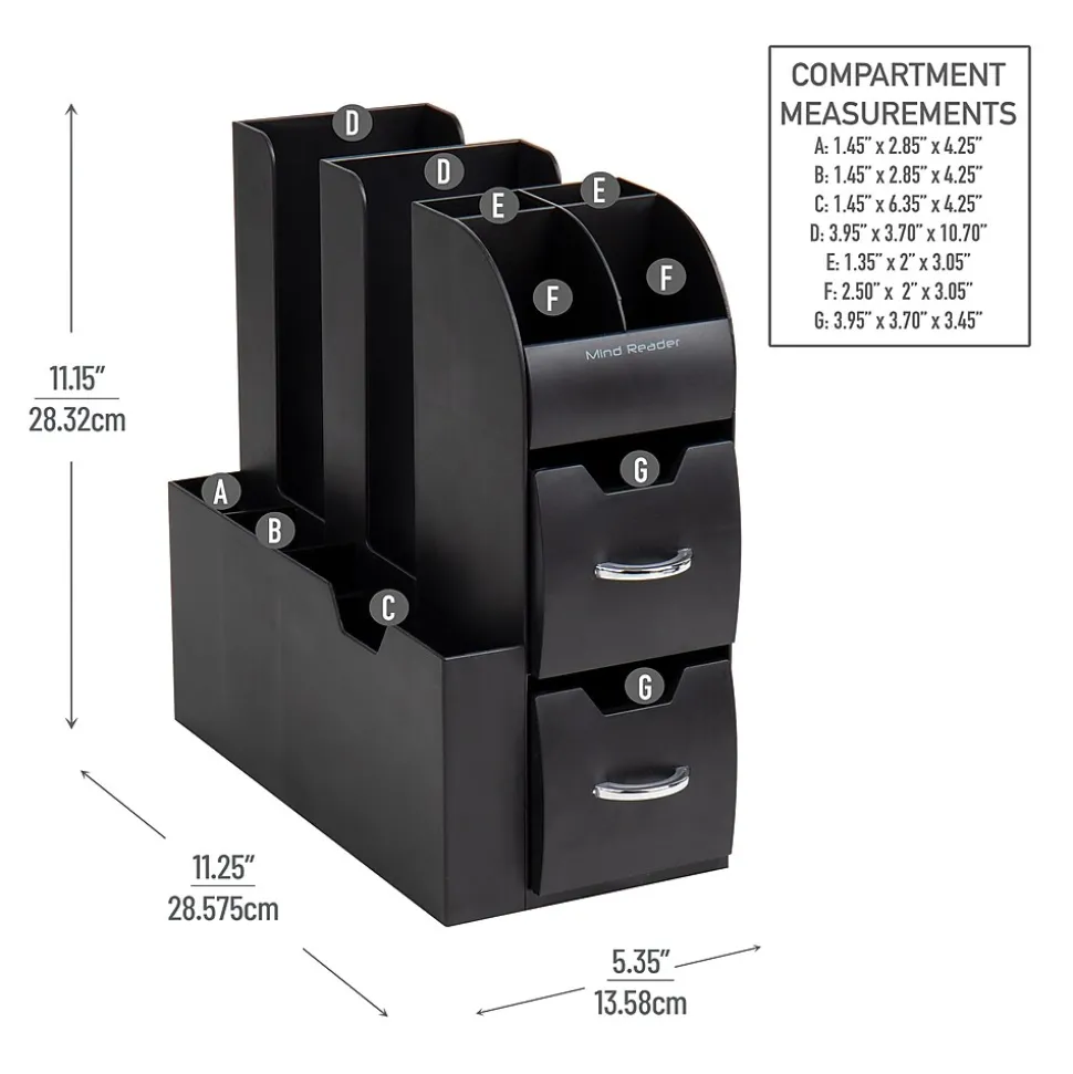 Revolutionize your storage space with this set of two organizers, designed with eleven compartments for storage of your coffee, tea, condiments, and more. This organizer is perfect for high-traffic areas like college dorms, office breakrooms, hotel lobbies, or even your home kitchen.No assembly is required, so you can instantly use it in your kitchen, office, or even in cabinets to store small items. Each 11-compartment organizer features three tiers and two drawers, providing ample space for all your essential items.From single-serve coffee pods, creamers, sugar, and stirrers to makeup and toiletries, this versatile organizer is perfect for anyone who loves to keep their space orderly. It features a 3.75-inch (9.5 cm) opening, allowing you to stack 12-, 16-, and 20-oz cups and lids. Plus, dedicated compartments for utensils, napkins, tea bags, salt and pepper packets, and snack bars keep everything organized and within easy reach.In terms of aesthetics, the simple black color blends well with any decor, while the silver handles add a touch of modern design. Its durable, food-safe plastic construction ensures easy maintenance between uses. A great gift, this organizer set brings harmony and efficiency to any home, office, or hospitality space.