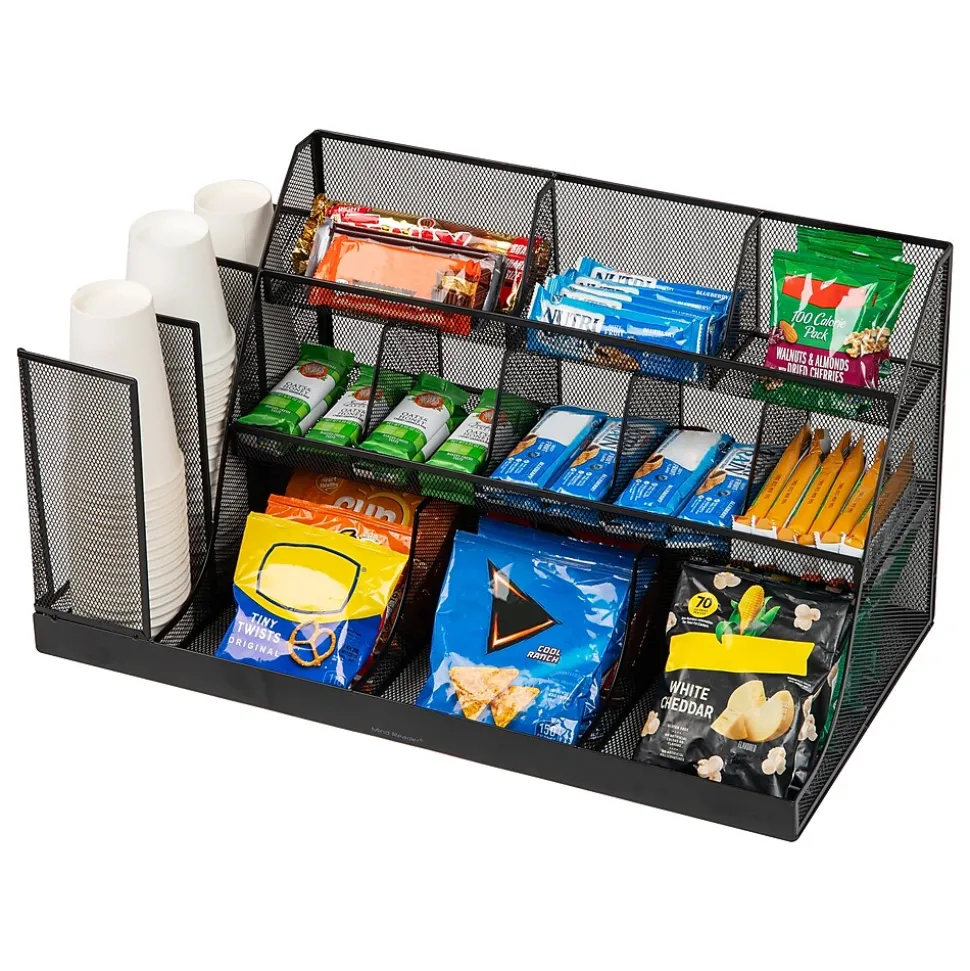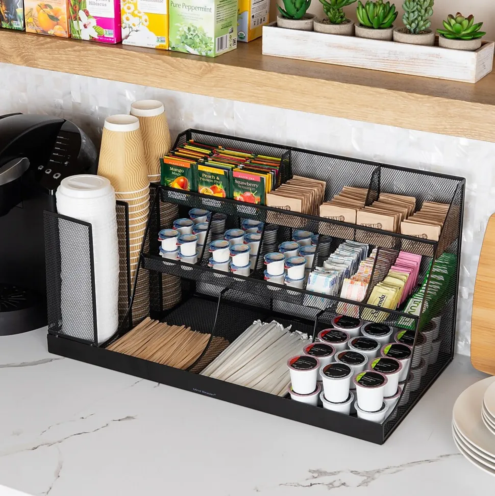 Elevate your coffee breaks with this expansive 3-tiered, 14-compartment cup, condiment, and snack organizer, eliminating chaos and unusable items. This station elegantly showcases items for easy access, catering to diverse preferences. It’s an ideal addition to hotel lobbies, breakrooms, hospitality suites, restaurants, and office receptions.Beyond coffee cups, condiments, and snacks, this versatile organizer serves creatively on countertops or in cabinets. Varied compartment sizes excel at organizing office supplies like pens, tape, rubber bands, and tacks. It’s equally adept at storing art supplies such as paintbrushes, glue sticks, scissors, and more.Maintenance is effortless – wipe with a damp cloth or rinse for stubborn messes. Built with durable metal mesh, it’s ready to use out of the box. Rubber grips keep it steady on countertops and in cabinets.Compact, lightweight, and robust, this organizer is travel-ready. Take it to hotels or dorm rooms, ensuring a well-organized coffee break wherever you go. It’s a thoughtful gift for travelers, students, business owners, and parents aiming for an easy snack station.
