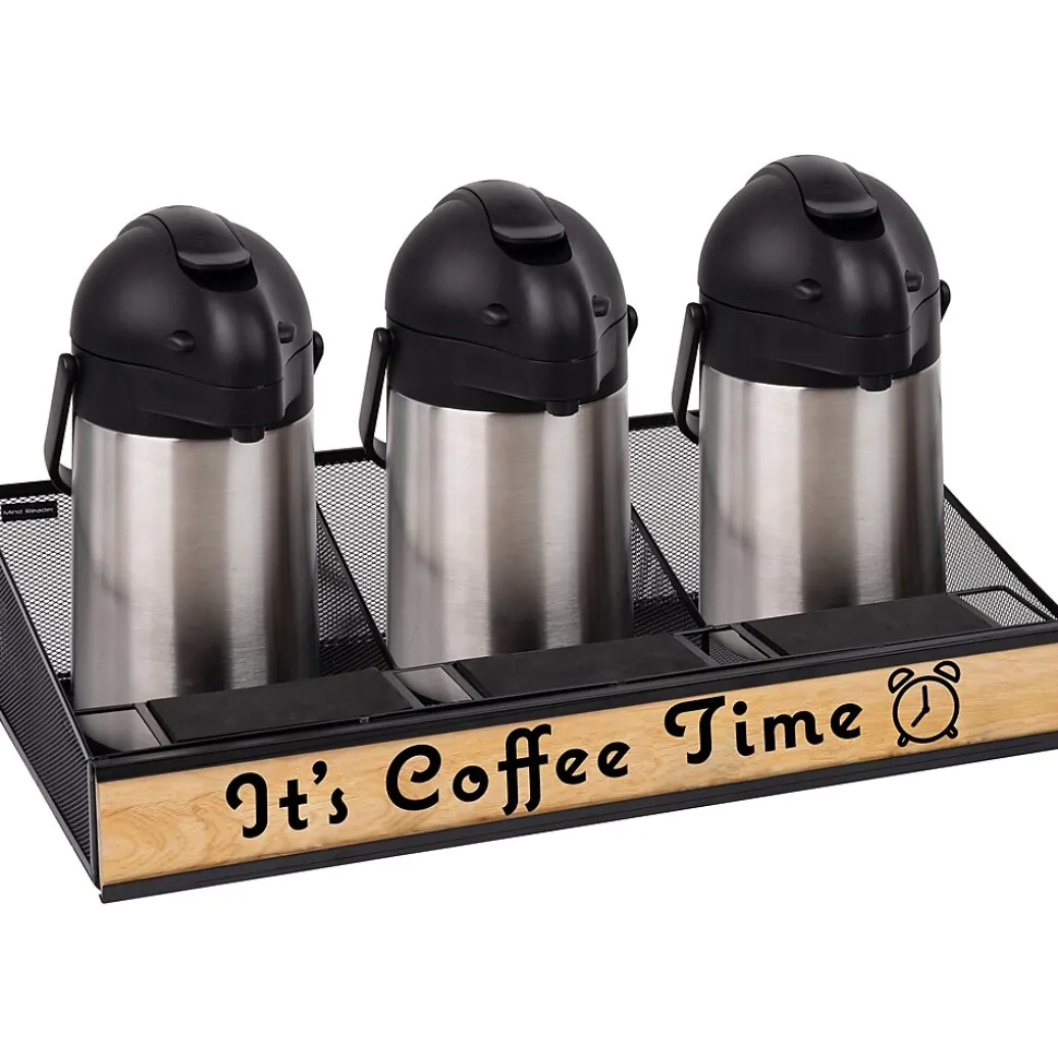 Look no further than this stylish and practical coffee station! The front of the station proudly displays the sign “It’s Coffee Time,” reminding everyone that their caffeine fix is just a few steps away.This coffee station features ample space for up to three standard-sized coffee airpots or carafes (not included), ensuring that there’s enough coffee to go around. The 6-inch height in the back provides stability for the carafes while they’re being used, so you don’t have to worry about any spills or messes.In addition to its functionality, this coffee station is also designed to keep your kitchen countertop clean and tidy. The front of the organizer includes a convenient ledge to hold coffee cups as they’re being filled, with an absorbent lip to catch any drips from the coffee or carafe.Say goodbye to assembly headaches with this no-assembly-required organizer. With its sleek design and durable construction, this coffee station is perfect for daily use and can be easily cleaned with a soft cloth and soapy water. It measures 24 inches long and is a great addition to any home kitchen, office break room, or bed and breakfast.