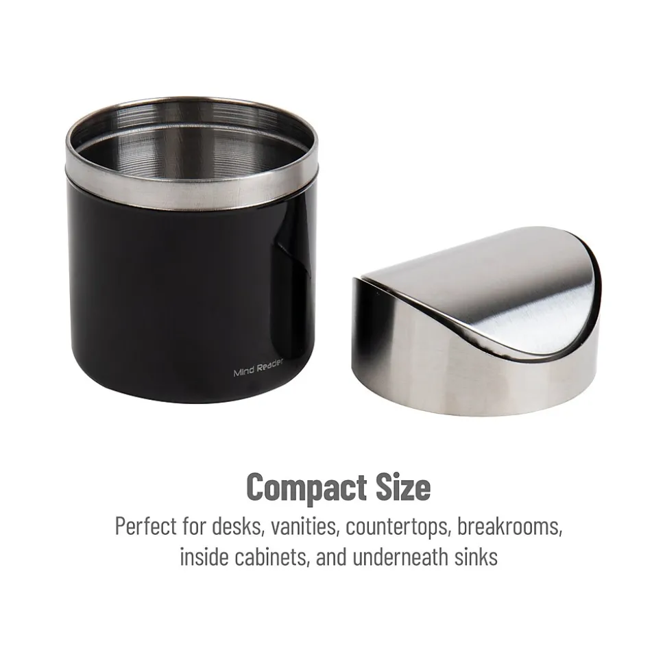 Introducing the perfect solution to pesky small pieces of trash, the compact countertop trash can. Finished in a fingerprint-resistant satin, this trash can effortlessly fits into any decor, making it a great addition to any home or office.Are you tired of having to walk to a larger wastebasket to discard small items? This compact trash can sits neatly on your desk, allowing for easy disposal of unwanted papers, coffee stirrers, single serve coffee pods, or other small pieces of trash. Standing just over 6 inches tall, it fits perfectly in any small space. It’s excellent for composting under a sink or cabinet or for recycling paper on your work desk.With this set of 2 compact trash cans, you can conveniently place one in another room or office. Ideal for breakrooms, they can be set up next to the coffee station for easy garbage disposal. The second trash can fits nicely in the bedroom or bathroom, discreetly holding discarded cotton swabs or balls, paper tissues, paper towels, and other frequently used items.These compact trash cans make excellent gifts for anyone needing a trashcan near their desk or for students heading to dormitories, where space-saving is always a priority. Make your life easier and neater with these compact countertop trash cans!