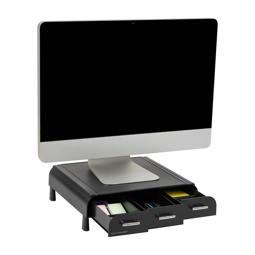Experience the benefits of an ergonomic monitor stand designed to improve posture, reduce neck and shoulder pain, and elevate your monitor to a comfortable eye level for optimal viewing. This monitor stand not only helps reduce muscle and neck strain but also frees up valuable desk space for increased productivity. Featuring six removable legs with rubber feet for stability and an attractive design, this stand includes a built-in desk organizer with three drawers, offering ample storage for office supplies. Made from high-quality plastic, it is strong, durable, and easy to clean for daily use. Measuring 13.5 x 13 x 4.25 inches and weighing 2.42 lbs, this monitor stand can hold a variety of monitor sizes and weights up to 22 lbs. Easily movable and versatile, it makes a great gift for students, those with small spaces, or people who enjoy traveling. Complete your workspace with other Anchor Collection products for a cohesive, organized look.