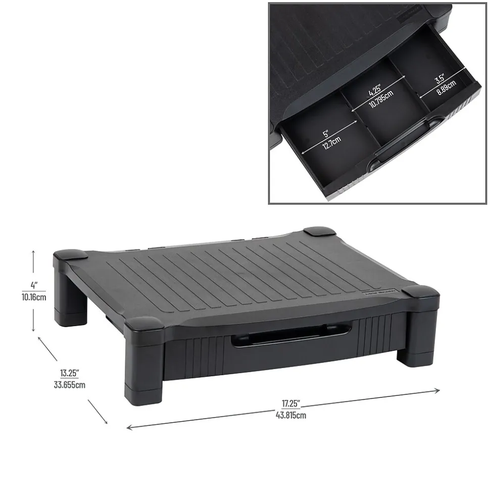- Dimensions: The monitor stand riser measures 17.25 long by 13.25 wide by 4 inches tall (43.82 by 33.65 by 10.16 cm) and weighs 3.48 lbs (1.58 kg)