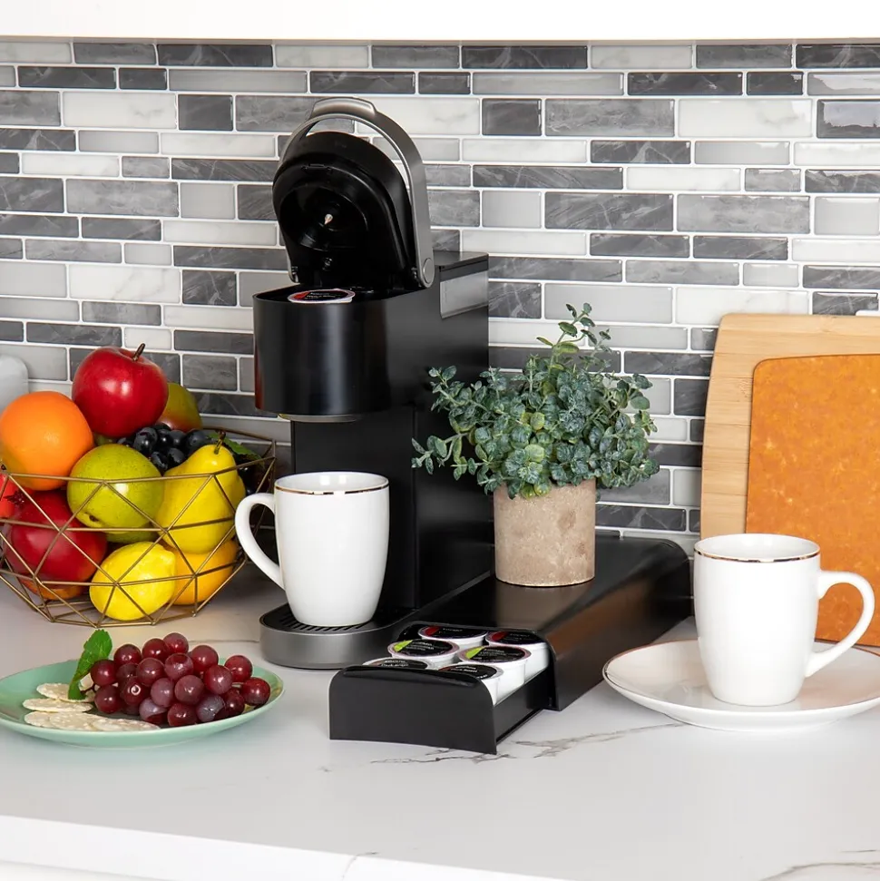 Start your day hassle-free with this sleek and slender single-serve capsule or pod countertop drawer. Made from durable black plastic, this compact organizer holds 12-14 capsules or pods and serves as a coffee machine base, maximizing your countertop space. The open interior allows you to store and organize various hot beverage options to suit any taste or mood, eliminating the need for multiple capsule boxes cluttering your counter.Maintaining this organizer is a breeze, as it can be quickly cleaned with a soft, damp cloth or paper towel. The lightweight design makes it perfect for taking on your travels, ensuring your favorite flavors are always close at hand. This attractive single-serve drawer makes an excellent gift for teachers, college students, or co-workers looking to streamline their morning coffee routine in style.