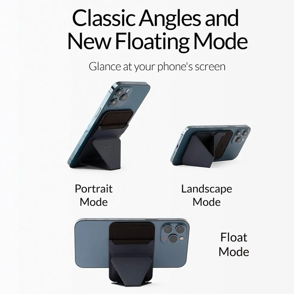 The MOFT Snap-on Phone Stand and Wallet for iPhone 12 and 13 Series in Oxford Blue employs dual magnets to attach securely to iPhone 12 series and beyond. The fold-design allows for intuitive and flexible usage. Simply snap it on, stand it up, and fold it back into place. At 0.2 in. (5 mm), it’s extremely slim but has the ability to hold up to 3 cards for your everyday carry needs. This also allows you to securely hide and easily access your cards without the need to snap it off your phone. It features 3 viewing modes which enable you to look at your phone screen in the most comfortable way, whether you’re browsing the web in portrait, streaming in landscape or having a Zoom meeting in floating mode. Experience your iPhone hands-free from every corner of your home with MOFT’s wall sticker pads which can attach on any surface, like a wall or fridge, to transform your phone into an exercise, bath time, or cooking companion. It’s also wireless charger-friendly: just sandwich the wireless charger pad between the phone and stand for charging.
