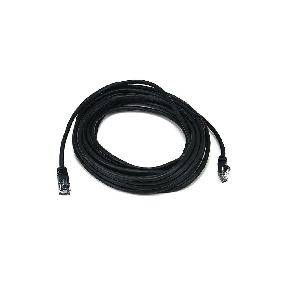 Monoprice® 25′ Cat5e UTP Ethernet network cable with a data transfer speed of 350 MHz has 50 micrometer gold plated contacts for enhanced conductivity. Cable in black color has snagless strain relief boots and provides reliable performance.