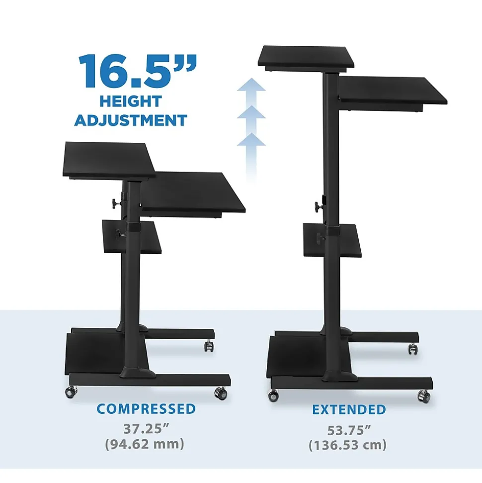 Raise and lower your work surface quickly and effortlessly, so you can work better. Its ergonomic, mobile, space saving attributes make it an attractive choice in all types of businesses, offices, trade shows, mall kiosks, retail stores, factories, schools, hospitals, and even at home. No tools needed – locking rotary knobs make height adjustment easy. The height of the top two platforms can be adjusted from a minimum of 37.25 inches to a maximum top shelf height of 53.75 inches. 16.5 inches of height adjustment allows you to find a comfortable sitting and standing position throughout the day.