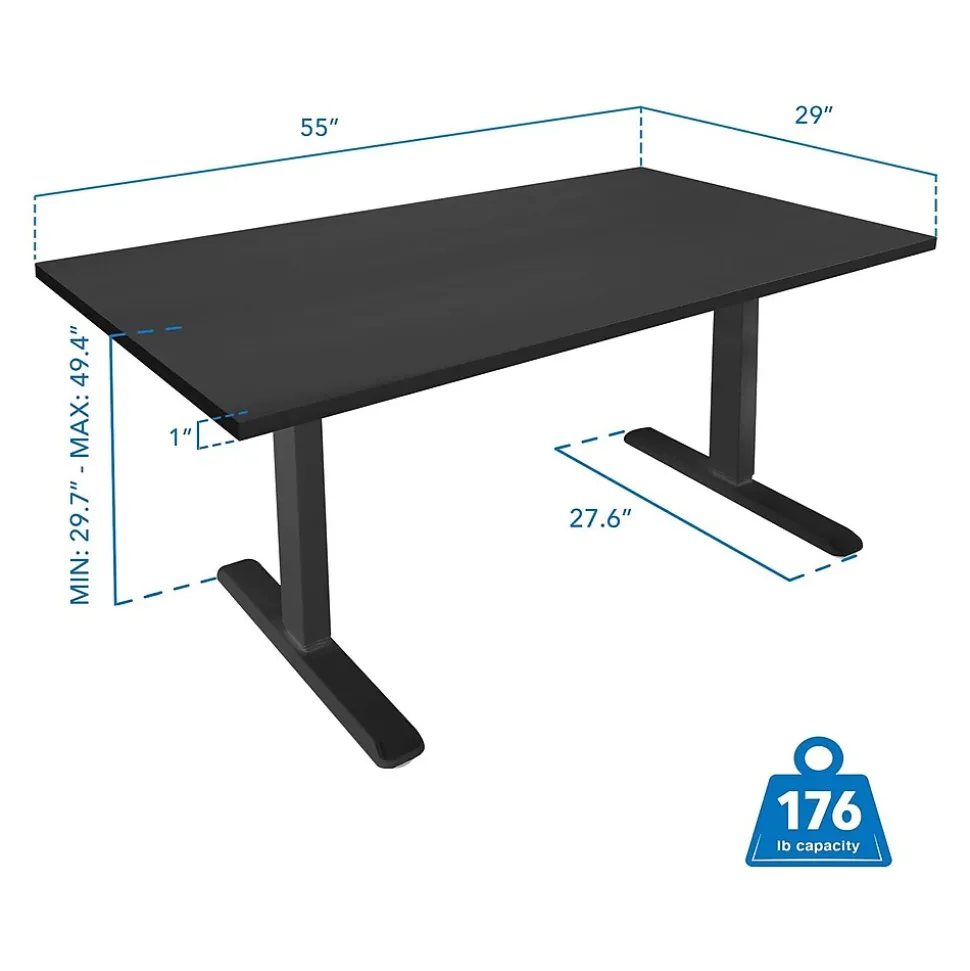 Add movement to your work day and improve health and productivity with this Mount-It! height-adjustable desk. This desk with black frame and black tabletop enhances any workspace at home or in the office. Enjoy quiet height adjustment between 29.7″ and 49.4″ at the touch of a button. The digital control panel with memory feature allows you to program up to three different heights so that the desk can be easily adjusted to your preferred sitting and standing positions. Additional features include a cable tray and leveling feet. Improve ergonomics and reduce the negative effects that sedentary work can have on your health with this electric sit-stand desk.