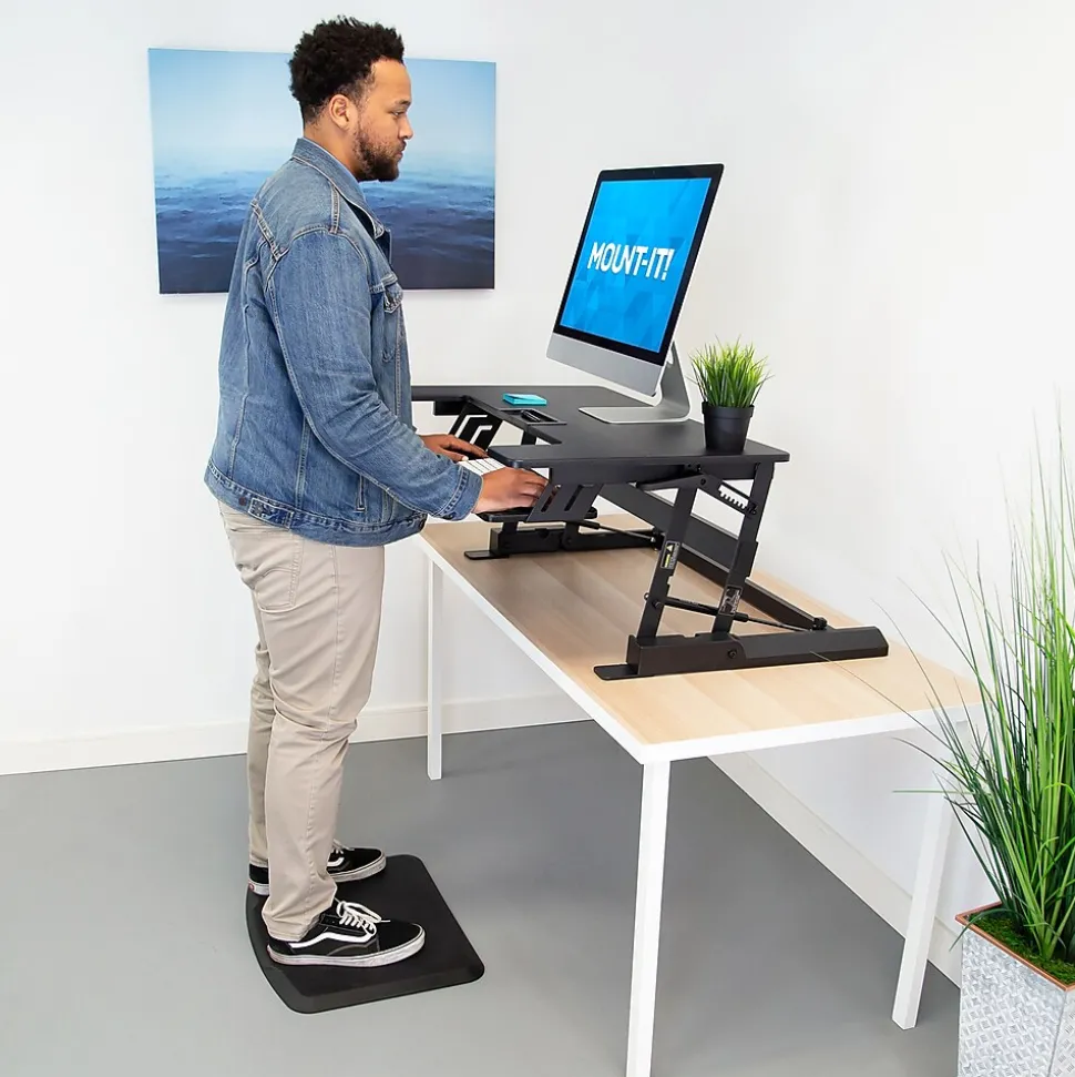 This bundle includes a height adjustable manual sit stand desk converter large enough for two monitors and a soft anti-fatigue mat for more comfort and less pain while standing at work. The Active Essentials Plus ergonomic bundle can easily and quickly turn any existing workspace into a healthier, more active workstation and is perfect for those looking to create a more comfortable and ergonomic work environment. Maintain a healthy balance of sitting and standing throughout the day to increase productivity, boost energy and improve your workflow. Start on the path to a healthier way to work with this ergonomic workstation bundle.The manual height adjustable standing desk converter features a wide 36” tabletop and can adjust from 6.25” to 16.5” high, allowing you to create a customized setup throughout the day.Our anti-fatigue mat is a necessity with any standing desk. The soft cushy floor mat allows you to stand longer at your standing desk without the pain associated with prolonged periods of standing.