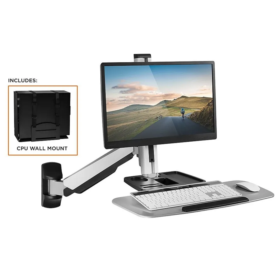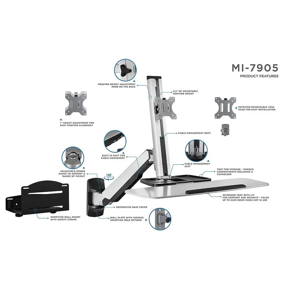 The Mount-It! MI-7905 is a full motion, wall-mounted workstation designed to give you the option to sit or stand in seconds. The heavy-duty spring arm uses counter-balance technology so you only need to set it once to the optimal tension, and then you will be able to effortlessly move your sit-stand up to 19.9″ for the desired height. The single monitor VESA bracket works with monitors up to 27″ and can be tilted for the optimal viewing angle.The wide keyboard is 26.2″ L x 10.2″ D and it conveniently folds away when you don’t need it.The MI-7905 also features an organizer tray, built-in cable management ducts, and a bonus wall-mountable, CPU holder for a complete standing computer station.