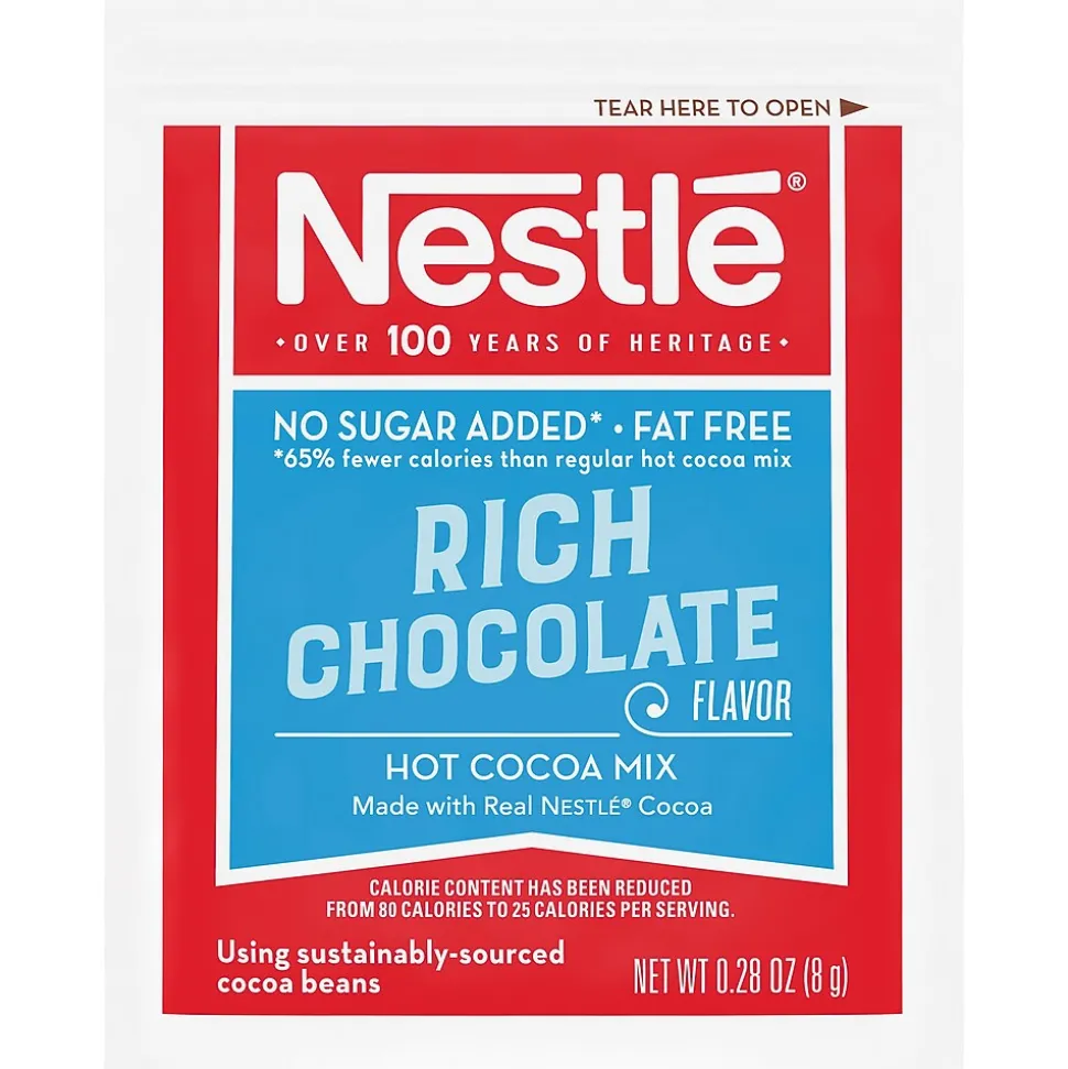 Nestlé Hot Cocoa, No Sugar Added, Fat Free Rich Chocolate Flavor is a rich-tasting, no sugar added and fat free hot cocoa mix that creates a rich and indulgent chocolate flavor. Made with real Nestlé cocoa using sustainably-sourced cocoa beans, our hot chocolate is part of the Nestlé Cocoa Plan to promote better farming, better lives and better cocoa. Just add hot water or milk and treat yourself to a delicious, 99.9% caffeine-free cup of cocoa. Single serve hot cocoa packets are perfect for offices, cafeterias, restaurants and more. Kosher Dairy.