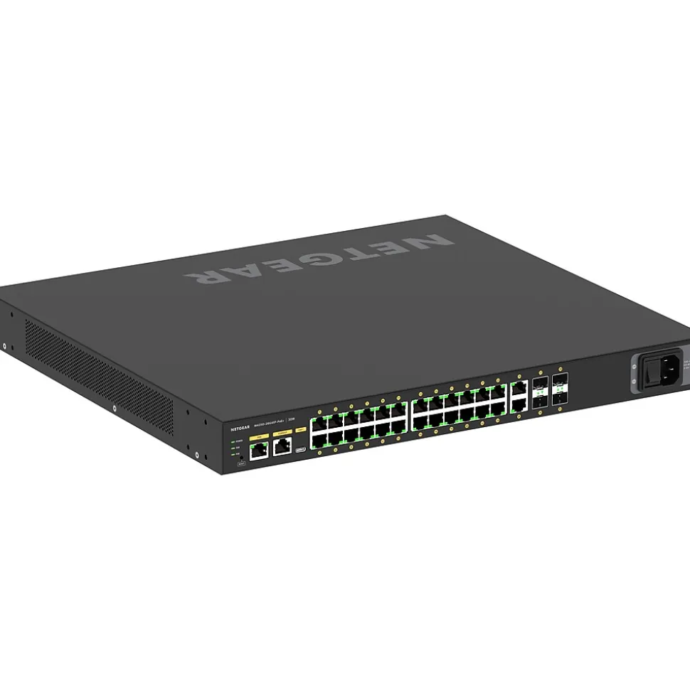 - Layer 3 managed switch with 26x gigabit Ethernet and 4x 10Gbps SFP+ ports engineered for 1Gb AV over IP