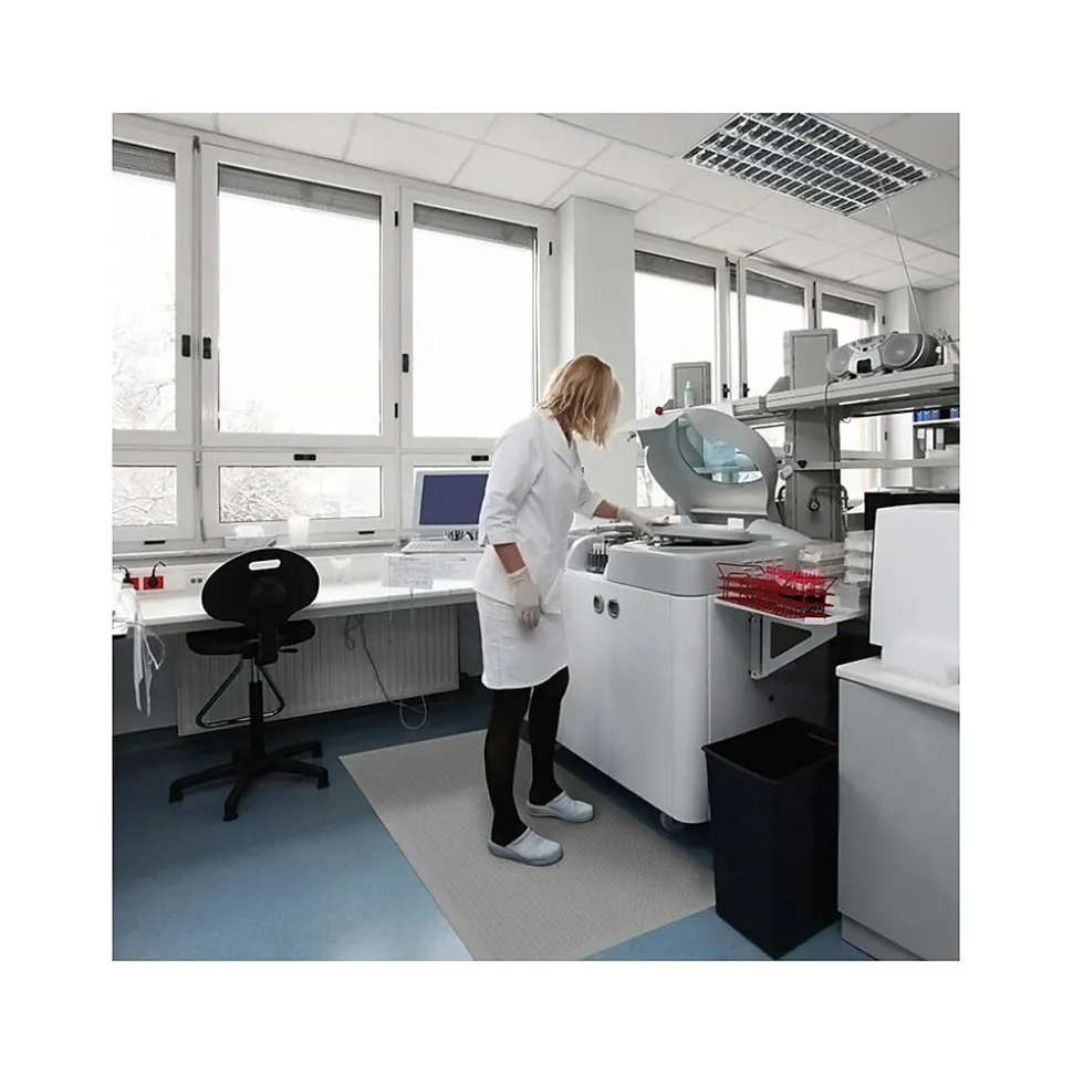 The NoTrax autoclavable bubble mat is a rubber anti-fatigue floor mat with a bubble top design. Offset bubbles on both the top and bottom of the mat provide flexibility and create airflow, resulting in maximum comfort for workers required to be on their feet for long periods of time. An industrial-grade antimicrobial agent inhibits the growth of most gram-positive and gram-negative bacteria and fungus on the mat’s surface. This ensures that the antimicrobial properties won’t wear-off over time like many post-applied topical agents. Although intended for use in dry environments, the top surface design is easy to wipe clean and the durable rubber compound is highly resistant to many hospital-grade cleaners and disinfectants, so occasional spills can be cleaned up quickly and easily. Molded beveled edges on all four sides eliminate trip hazards by allowing for easy access onto and off the mat.