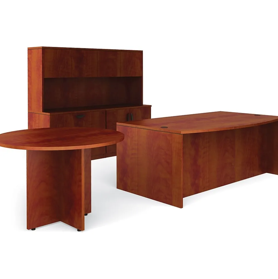 Global Offices to Go Superior bundle in american dark cherry finish is made of commercial grade laminate surfaces for durability. It includes bow front desk shell, lateral file, mixed storage unit, common top and hutch.