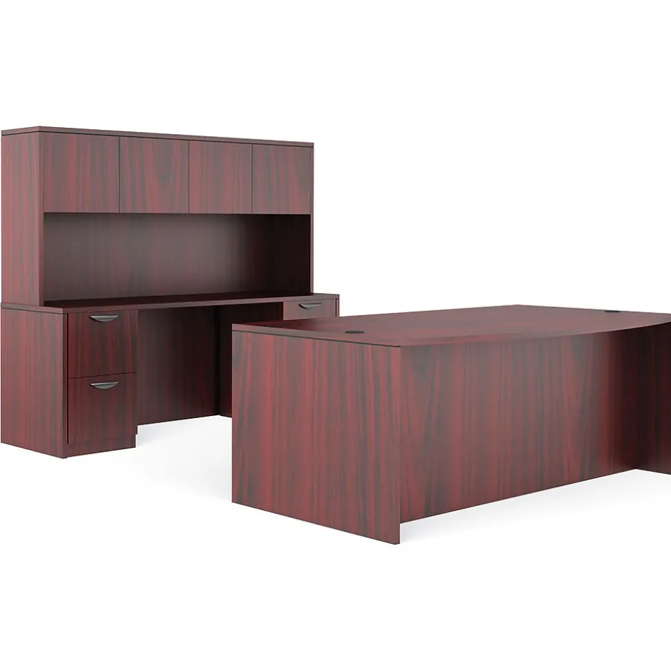 Global Offices to Go Superior bundle in american mahogany finish is made of commercial grade laminate surfaces for durability. It includes bow front desk shell, credenza shell, hutch, box/file pedestal and file/file pedestal.