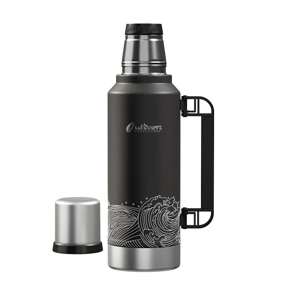 The Outdoors Professional Black Waves 33.8-Oz. Termo Classic Vacuum Bottle with Carry Handle is made with superior insulation that keeps liquids (soup, coffee, tea) hot for up to 24 hours or cold drinks cool for up to 24 hours. Add ice to your favorite beverage and the Termo classic will keep it cold for up to 5 days. The rustproof stainless steel construction means it can work just as hard as you do without impacting its performance. This is an ideal bottle to throw in your truck, work bag, or travel with it. It’s made with BPA-free materials, keeping its contents safe to consume. This 1-L bottle features a leak-resistant lid, so you can put it in your backpack without worrying about any spills. The wide mouth opening helps with easy pouring into the lid that doubles as a cup. The collapsible handle makes it easy to transport when you’re on the go.