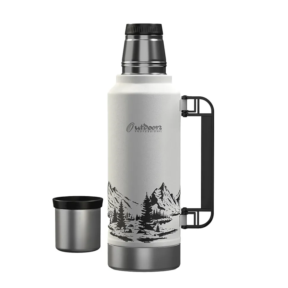 The Outdoors Professional White Mountains 33.8-Oz. Termo Classic Vacuum Bottle with Carry Handle is made with superior insulation that keeps liquids (soup, coffee, tea) hot for up to 24 hours or cold drinks cool for up to 24 hours. Add ice to your favorite beverage and the Termo classic will keep it cold for up to 5 days. The rustproof stainless steel construction means it can work just as hard as you do without impacting its performance. This is an ideal bottle to throw in your truck, work bag, or travel with it. It’s made with BPA-free materials, keeping its contents safe to consume. This 1-L bottle features a leak-resistant lid, so you can put it in your backpack without worrying about any spills. The wide mouth opening helps with easy pouring into the lid that doubles as a cup. The collapsible handle makes it easy to transport when you’re on the go.