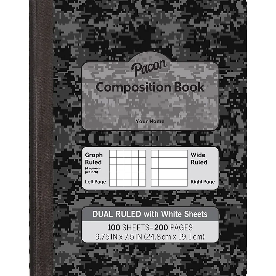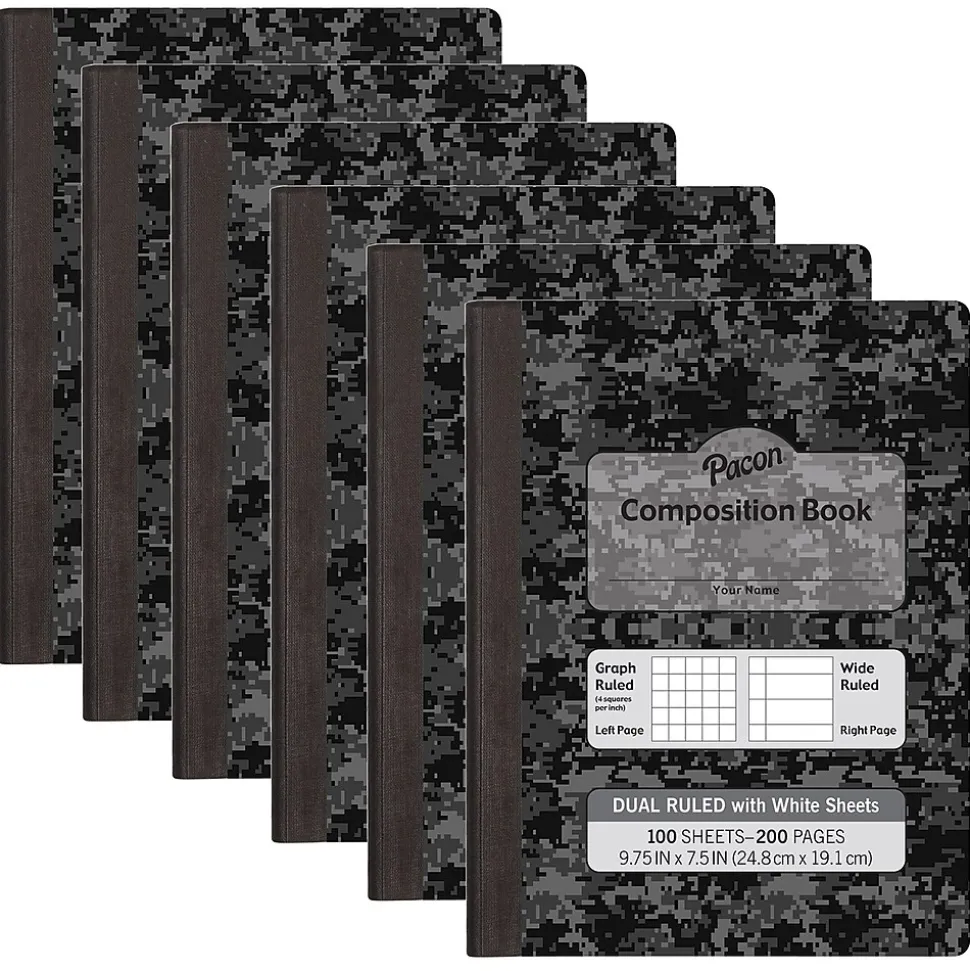 The PaconĀ® Dual Ruled Composition Books feature two alternating ruling styles. The right-hand page offers a 3/8″ wide ruling for traditional note taking and the left-hand page features a 1/4″ grid ruling to draw coordinating graphs, illustrations and interpretations. Note taking in this manner engages both hemispheres of the brain. These durable, hard cover, one-subject books feature a Dark Gray cover with White paper on the inside. Measures 9.75″ x 7.5″. Includes 100 Sheets (200 Pages) per book. Sold as a pack of 6 books.