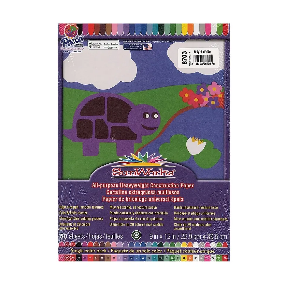 Brightly colored, all-purpose, high bulk, high strength, smooth textured heavyweight groundwood construction paper with long, strong fibers that cut clean and fold evenly without cracking. Electricity used to make this paper is generated from 100% hydro power. It is also made with a chemical-free pulping process to help ensure a cleaner environment. Recyclable.Each pack contains 50 sheets.