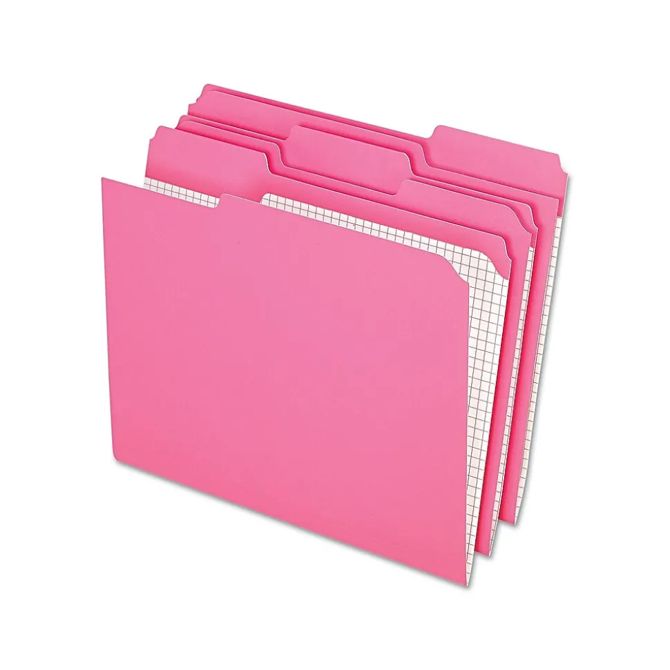 Prevent time-wasting misfiles with these Pendaflex recycled pink file folders. The 1/3-cut tabs have assorted positions to make identifying folder contents at a glance easy, while brilliant pink coloring helps with color-coding. With 100 folders per box, you can get your office organized with a single package. These Pendaflex recycled pink file folders have rounded edges to prevent tearing and paper cuts.