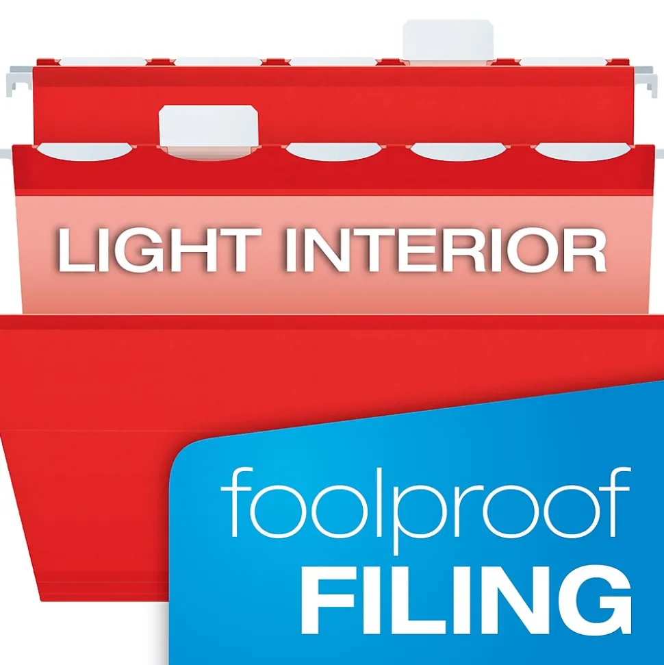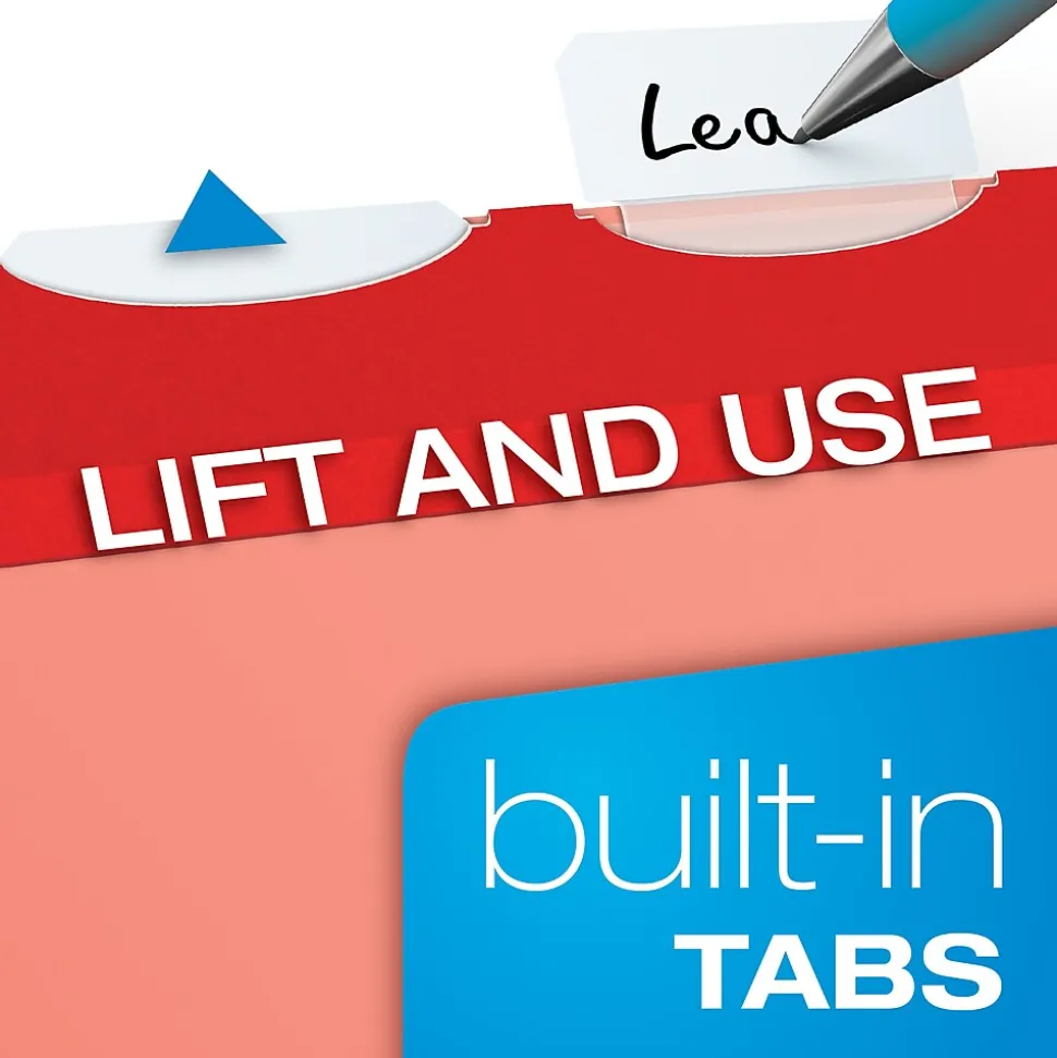 Pendaflex Ready-Tab hanging folders feature 5 built-in tabs for faster file setup. Simply lift the tab in the position you need. Includes a printer-ready sheet of adhesive labels. Reinforced top edge and bottom fold for additional durability. Letter size. Red.