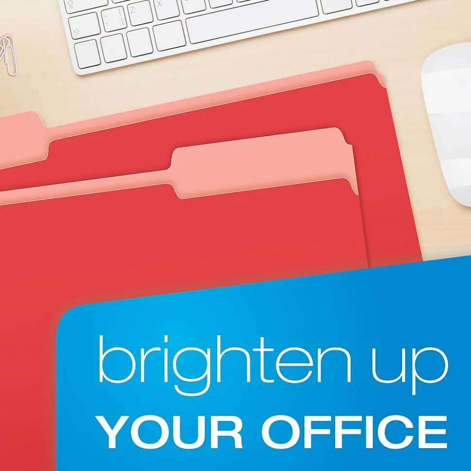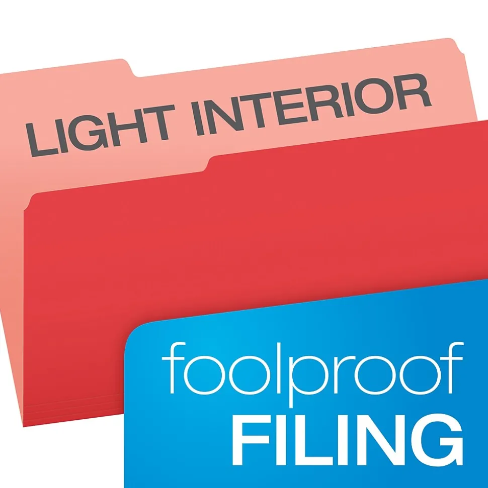 Interior file folder in red color fits neatly inside a hanging folders without obscuring tabs. Folder features two-tone design that prevent misfiles and is reversible to double your color options.