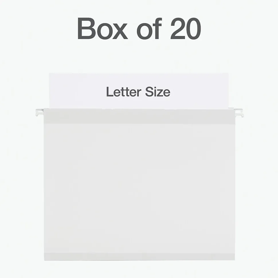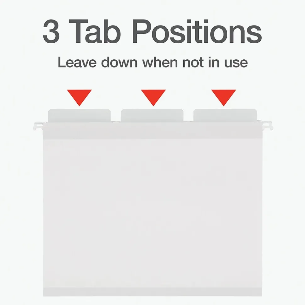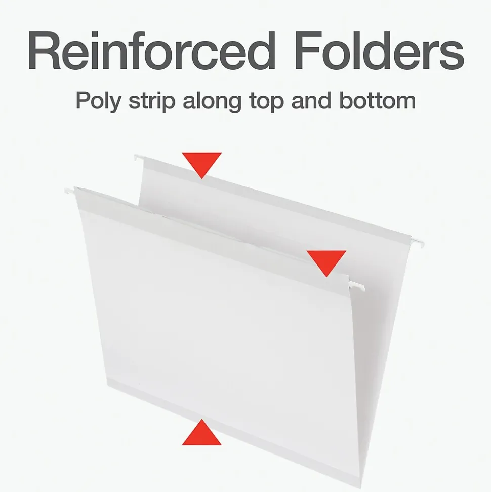 These Ready-Tab Reinforced Hanging File Folders have built-in tabs you can just lift and use. Poly strips at the top and bottom edges protect against rips and tears. They have large 1/3 cut tabs and include a printable sticker label sheet. You can also write on the tabs with a permanent marker. They fit standard, letter size 8.5″ x 11″ documents. Box of 20 white hanging file folders.
