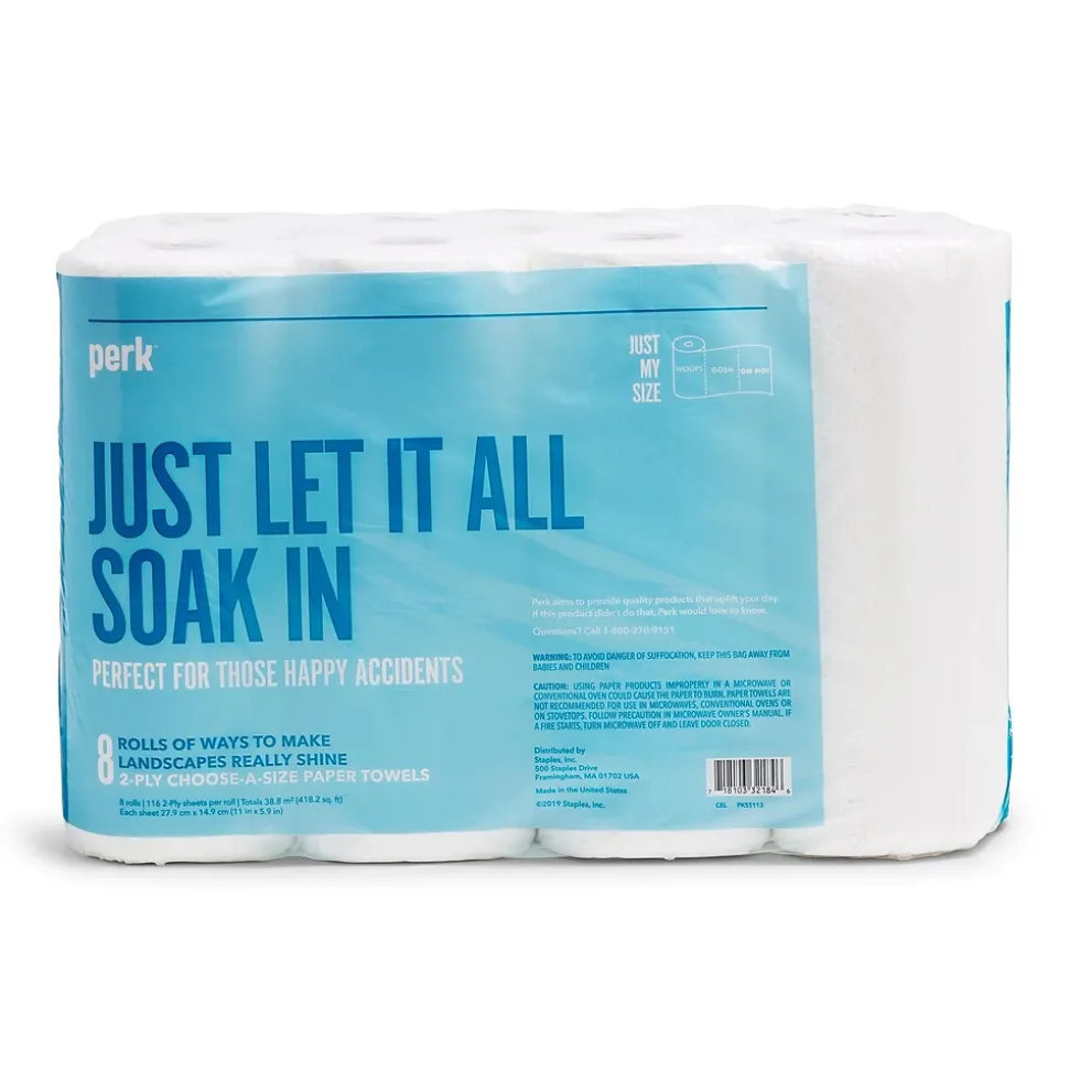 Holla back at spills on break room countertops with these thirsty white paper towels. Eight rolls in each pack deliver serious drying with no doubt, and just-my-size perforations reduce the overuse by providing a sheet made for every mess. With two-ply construction that soaks up each and every spill, these Perk™ Choose-A-Size perforated paper towels make messes a memory.