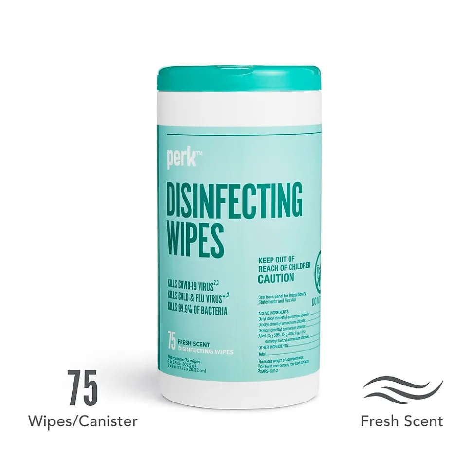 Clean and disinfect your workplace in one easy swipe with Fresh-scented Perk Disinfecting Wipes. These disinfecting wipes are proven to kill 99.9% of germs, including cold and flu viruses, E.Coli, Staph, Strep and Salmonella. Conveniently and safely take on every task from first sheet to last by cleaning, deodorizing, and disinfecting hard, nonporous, non-food-contact surfaces. These premoistened wipes remove germs and messes leaving behind a light lingering fragrance. They quickly clean and disinfect high-touch surfaces, such as doorknobs and faucets. Ideal for offices, classrooms, dorms, day care centers, hotels and other commercial facilities. This product will not harm most surfaces including acrylic, sealed fiberglass and vinyl. Sealed to prevent liquid loss, these Perk wipes easily stores away, staying moist and effective.
