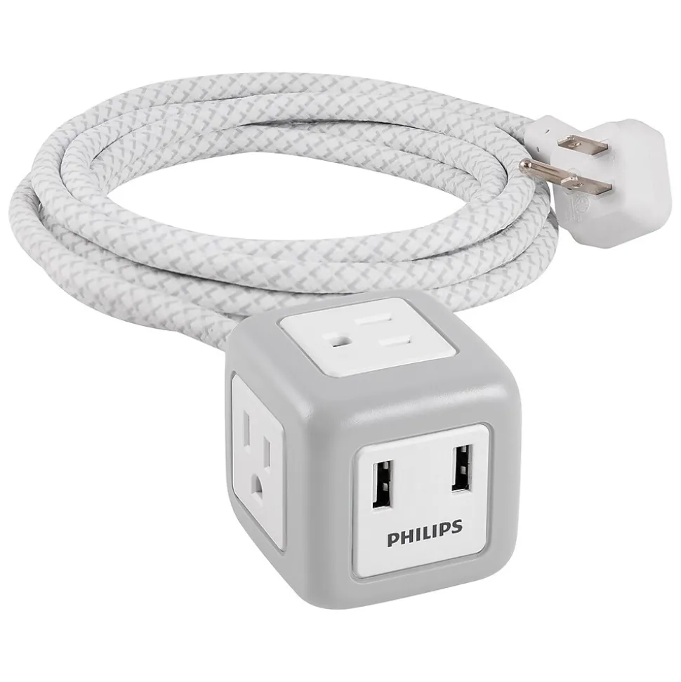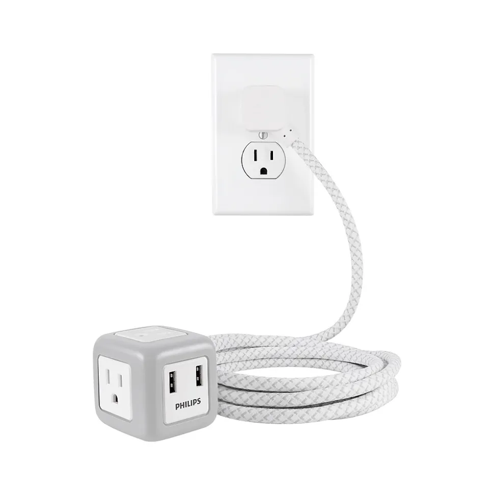 Experience the future of charging with the Philips USB extension cord cube. Featuring three adapter-spaced, grounded outlets and two USB Type-A ports (2.4A) in a unique cube design, this plug-in outlet extender transforms your regular outlet into a safe, multipurpose powering station. Power your everyday household appliances, lamps and seasonal lighting, tools and other electronics all from one location. While most cords interrupt or distract from your home’s decor, this unique designer cable only contributes to the overall charm of your space. The extra-long 10′ woven, white and gray fabric cord cover accents your home or work setup. The extra layer of fabric not only increases the cable’s durability, but also keeps the cord from being bent and tangled.