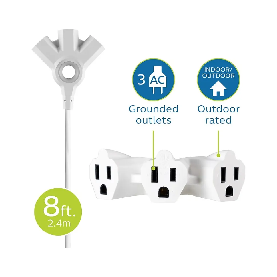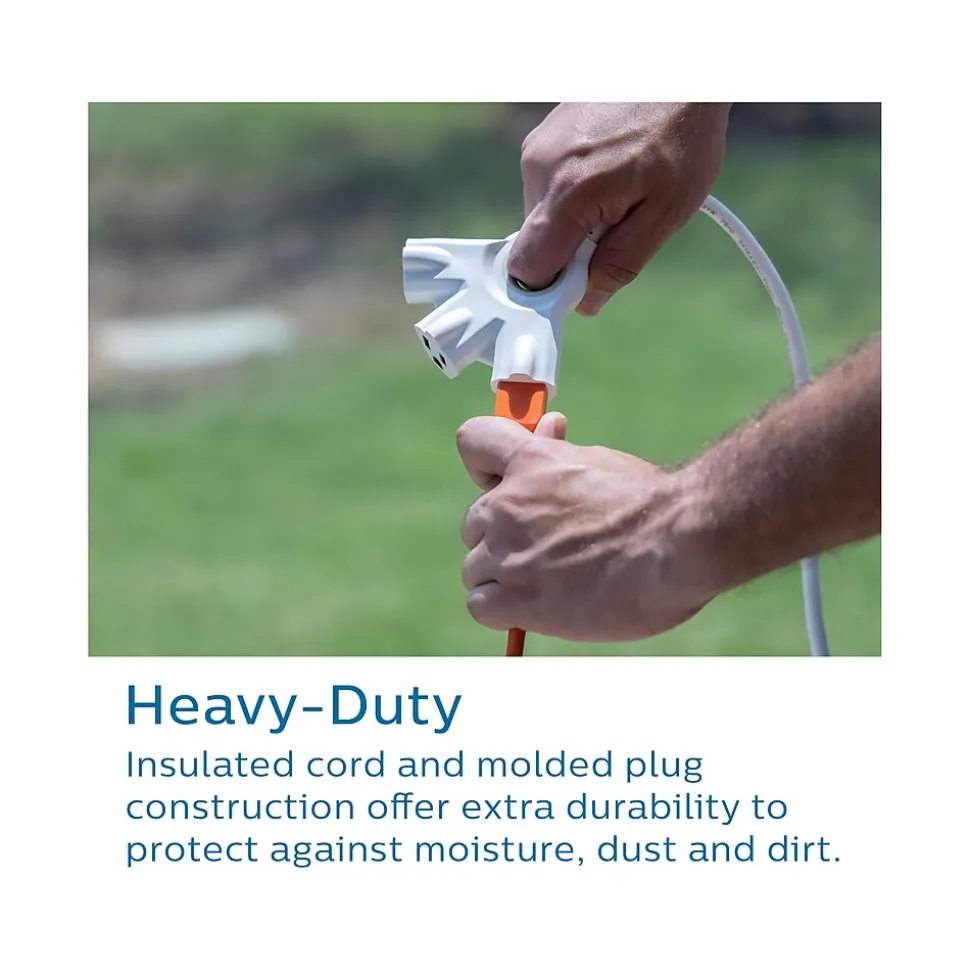 Get a grip on your electronics with the Philips EZ Grip three-outlet 8′ indoor/outdoor extension cord. Featuring three grounded outlets, this extension cord extends the output of any grounded AC outlet. The advanced design of the EZ Grip extension cord includes built-in ergonomic handles, making it easy to properly and safely attach and disconnect electronics. Use this versatile cord outdoors for power tools, patio lights, or yard decorations. This cord is also rated for indoor use to power your electronics, appliances, and mobile devices. Whether in the home, garage, workshop, or office, the dynamic 8′ range of this cord makes extending the reach of your outlet effortless. This heavy-duty outlet extender is constructed of 16-gauge cable housed in a durable PVC insulation and jacket that makes it strong enough for the toughest jobs but pliable enough to easily fully extend. The high-visibility white finish of this cord allows it to stand out from existing cords and cables.