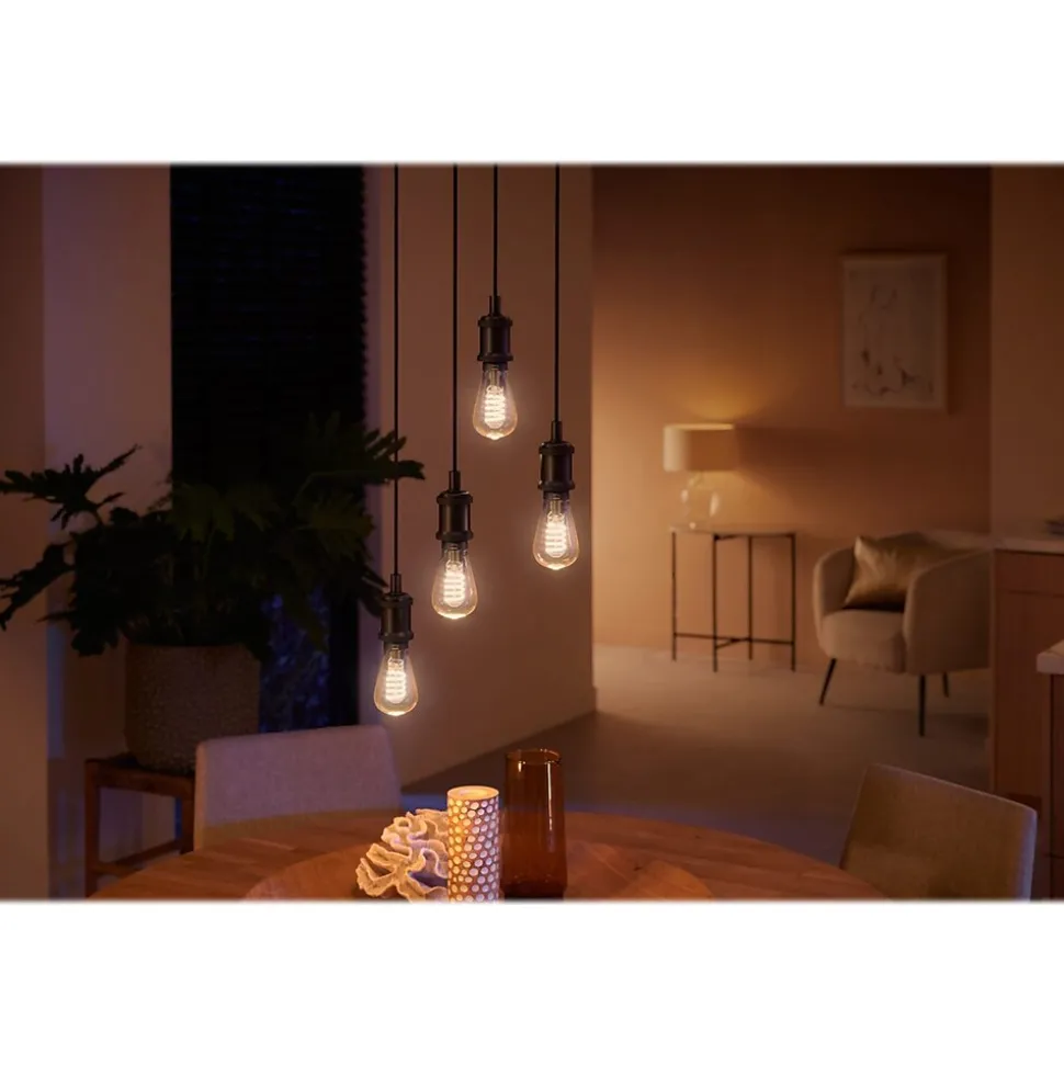 Vintage style meets modern smarts with this ST19 smart bulb. Perfect for smaller light fixtures and lamps, this Edison-style LED bulb offers the full suite of smart features, warm-to-cool white light, and an E26 base. With the Hue Bluetooth app, you can control your Hue smart lights in a single room of your home. Add up to 10 smart lights and control them all with just the touch of a button on your mobile device.