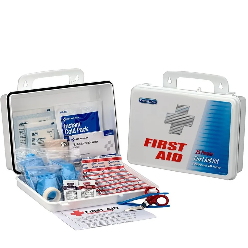 PhysiciansCare® First aid kit refill contains 130 items and is ideal for individual use. Refill includes adhesive fabric bandages, antiseptic wipes, ice pack, burn cream, 2″ conforming gauze, 2″ x 3″ nonstick pad, roll of tape and more.