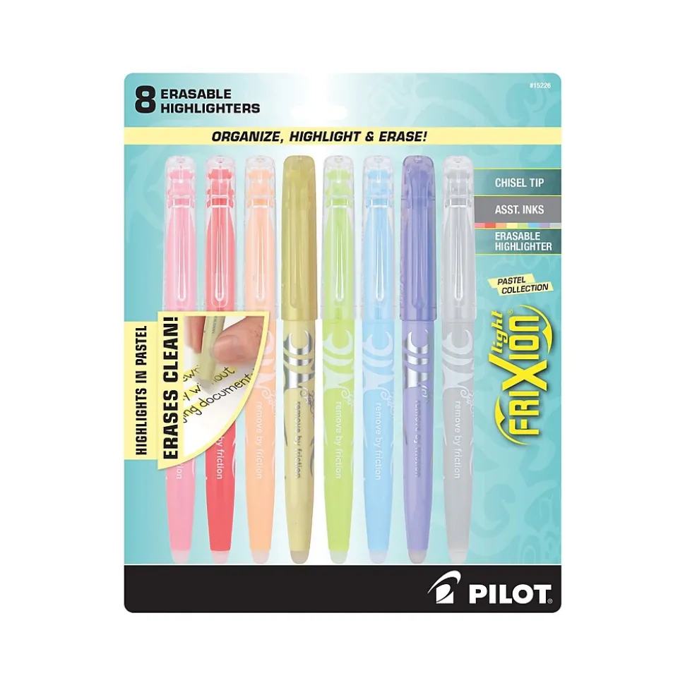 Pilot’s FriXion Light Pastel erasable highlighters with chisel tips feature soft, soothing, sophisticated highlighter colors designed to erase cleanly and emphasize what you want without fluorescent pigments. The future of highlighting is here. While highlighting work, notes, or textbooks, everyone has accidentally highlighted the wrong word, or ended up with a completely fluorescent over-highlighted page. So, it would be ideal to have more soothing highlighter color options and be able to unhighlight certain sections. With the FriXion Light Pastel series highlighters, that’s not a problem. Simply rub the erasing tip at the top over the highlighting and the ink will disappear cleanly, with no eraser shavings. The FriXion Light Pastel erasable highlighters allows you to highlight, erase, and re-highlight repeatedly without damaging documents. The FriXion unique thermosensitive ink is formulated to deliver both smooth pastel color and complete erasing.