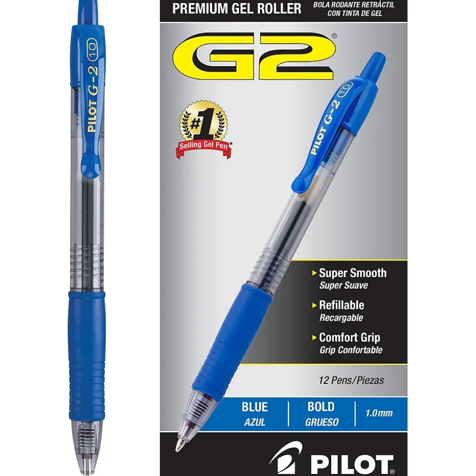 Make your notes stand out with these blue Pilot G2 premium retractable gel roller pens. The rubber grip is ridged, allowing for superior control and comfort, while the retractable design helps prevent staining, whether they’re stored in a bag or in a pocket. These blue Pilot G2 premium retractable gel roller pens use a bold point to make your writing stand out, while the quick-drying ink prevents smearing.