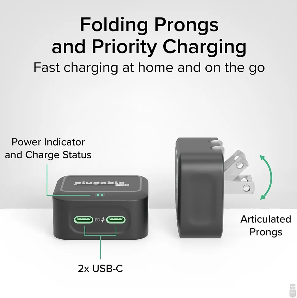 Plugable Dual USB C Wall Charger, 40W Foldable 2-Port Flat USB C Fast Charger Block