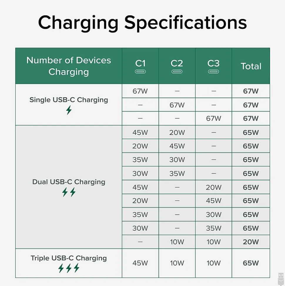 - Triple USB-C – Plugable’s fast charging block features 3x USB-C ports providing up to 67W total. An LED display shows combined power output so you always know what your connected USB-C devices are pulling. Ideal for home, office, or as a travel charging station
