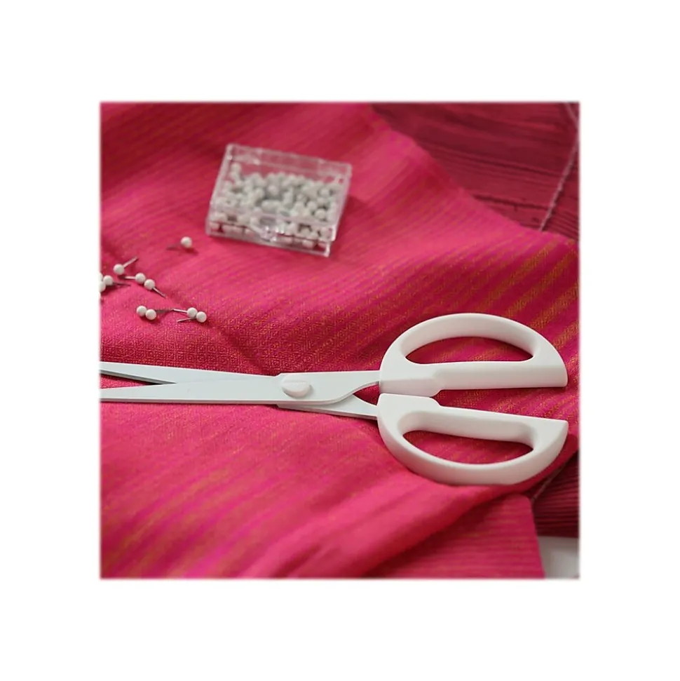 Cut effortlessly through art and craft materials with these white scissors. The round, molded handles offer precise control. These Poppin scissors have long, Teflon-coated blades that work smoothly on sticky surfaces.