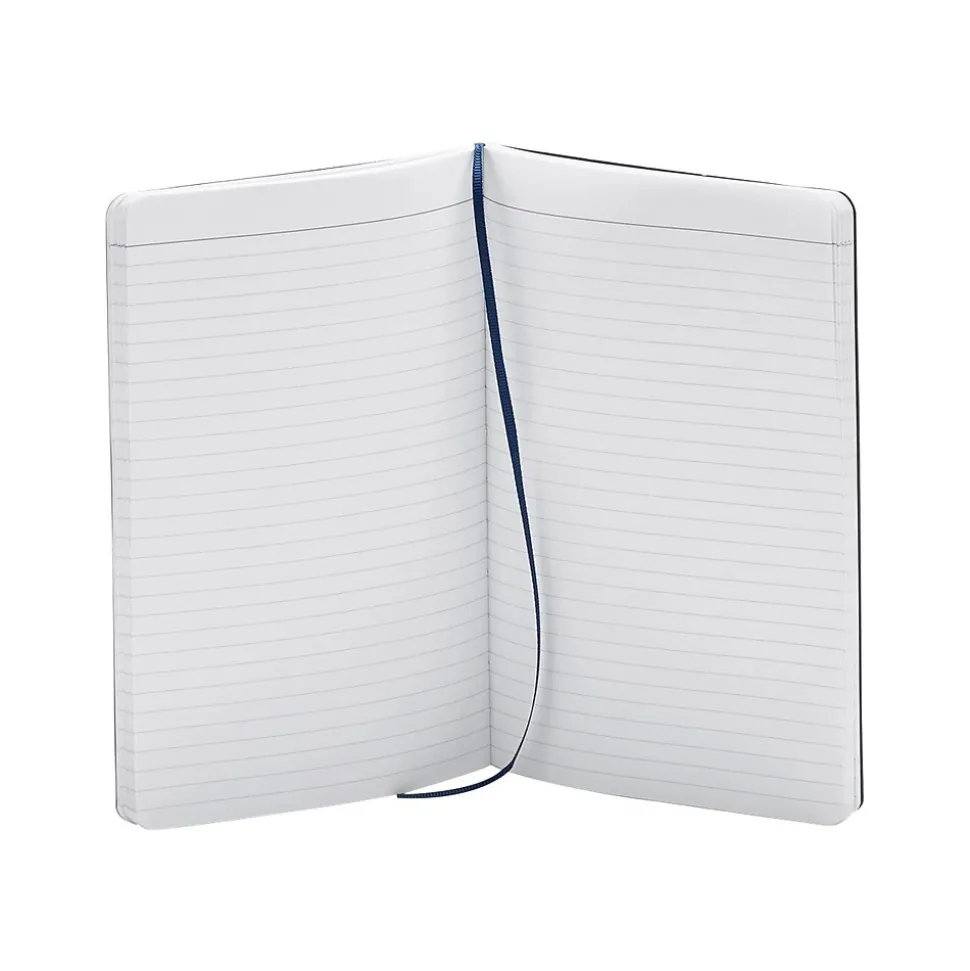 Enjoy the easy portability with this soft-cover notebook. With a portable and bendable design, this notebook is ideal for taking with you on the go and comes with an elastic closure, providing protection to pages and keeping your ribbon bookmark in place. This Poppin navy notebook has 192 lined white pages, providing plenty of room for sketches, charts and other projects.