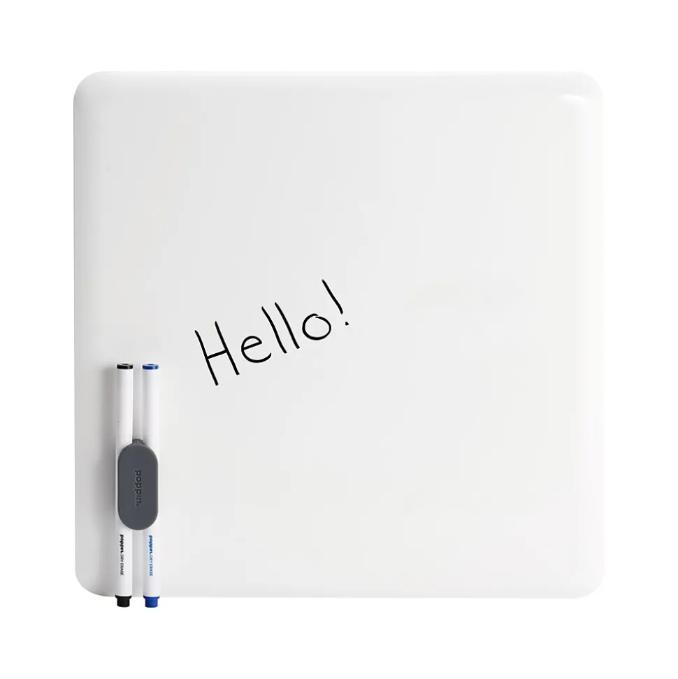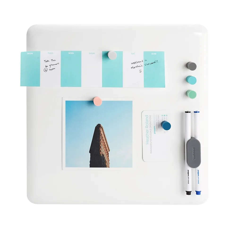 Organize your daily to-do lists, appointments and other activities with this dry-erase board. The magnetic surface makes it easy to attach notes and photos, while the crisp white color helps dry-erase markers stand out for better visibility. A simple frameless design offers a modern look for your office or cubicle, and the durable powder-coated steel construction stands up to the rigors of daily use. This Poppin magnetic dry-erase board comes with adhesive strips, magnets and mounting screws for versatile setup options.