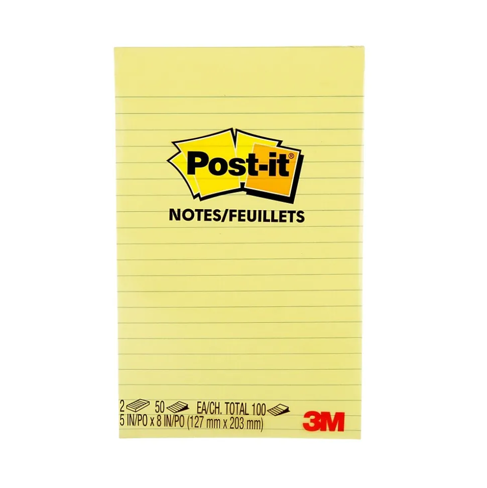 Post-it® Notes stick securely and remove cleanly, featuring a unique adhesive designed for use on paper. Use the 5 in x 8 in size to create lists, or to call out important information. Leave notes in calendars or planners. Canary Yellow color helps your note break through. Post-it® Notes are recyclable, and the paper is sourced from certified, renewable and responsibly managed forests. 2 Pads/Pack, 50 Sheets/Pad.