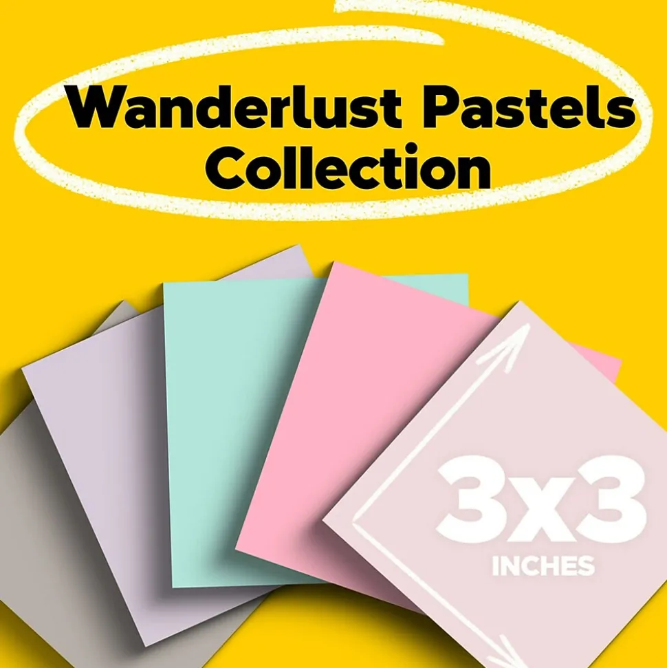 Post-it Recycled Super Sticky Notes in 3 in x 3 in feature 2x the sticking power. Use for notes or reminders on doors, windows or walls. Unique adhesive reliably sticks and re-sticks so your message can stay front and center. Move your notes with you throughout the day. Made with water-based adhesive and recycled material. Post-it Super Sticky Notes are recyclable and the paper in Post-it Super Sticky Notes is sourced from certified, renewable and responsibly managed forests.Explore the dreamy vibes from the Wanderlust Pastels collection. 5 Pads/Pack, 90 Sheets/Pad.
