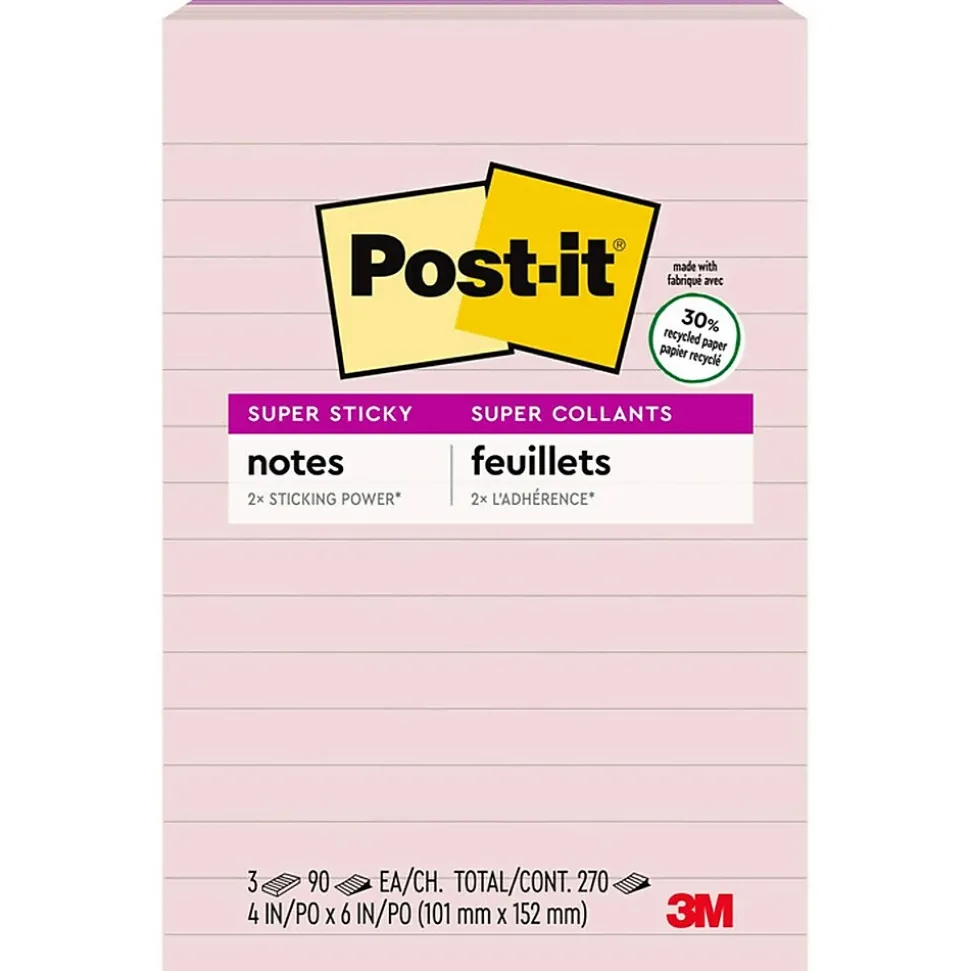 Post-it Recycled Super Sticky Notes, 4" x 6", Wanderlust Pastels Collection, Lined, 90 Sheet/Pad, 3 Pads/Pack (6603SSNRP)
