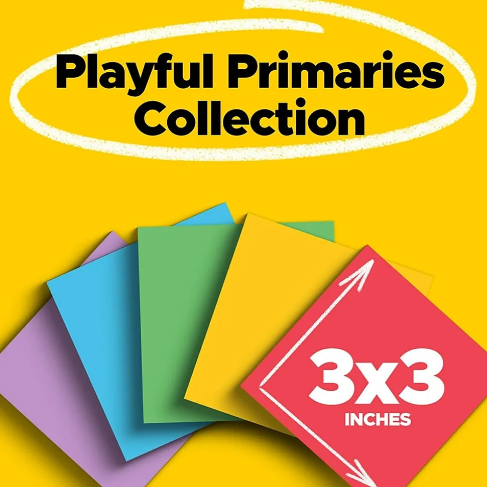 Add joy to the day alongside celebrated rainbow hues from the Playful Primaries collection. Whether jotting down your daily to-do’s, brainstorming big ideas, studying or setting reminders, colors and ideas are always brighter together. These sticky notes feature 2X the sticking power. They also stick and re-stick – allowing you to move your notes with you throughout your day. They’re ideal for walls, doors, windows and other vertical surfaces, and like all Post-it Notes, they stick securely yet remove cleanly without damage. Keep your ideas across your notebooks, classroom books, calendars or other documents. No tape or tacks are needed with adhesive notes, saving you money and time on office products or school supplies. A great memo pad, these are ideal for using for notes or reminders to yourself or others. Post-it Super Sticky Notes are the perfect solution for shopping lists, reminders, notes on computer screens, time tracking, to-do lists, marking cables, color-coding documents, reminding kids to do chores, storyboarding, scratch paper and agile processing. Each notes sheet is approximately 3 in. x 3 in., with 90 sheets per pad and 5 sticky note pads per pack. These colorful sticky notes include colors from the Playful Primaries collection including red, yellow, green, blue and purple. All Post-it Notes are sourced from certified, renewable and responsibly managed forests, and all Post-it Notes are recyclable, so you can recycle them when they are no longer needed.