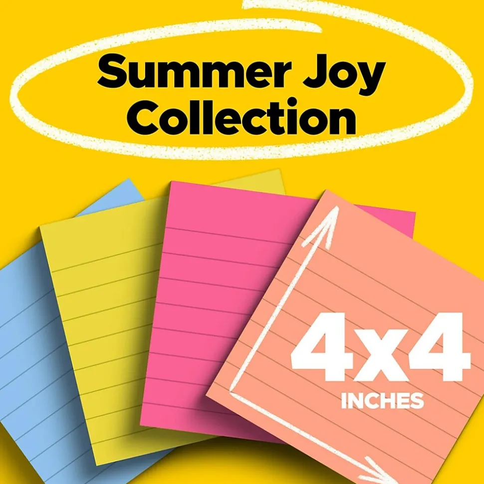 Share the warmth of the summer sunshine memories all year long with the Summer Joy collection. Whether jotting down your daily to-do’s, brainstorming big ideas, studying or setting reminders, colors and ideas are always brighter together. These sticky notes feature 2X the sticking power. They also stick and re-stick – allowing you to move your notes with you throughout your day. They’re ideal for walls, doors, windows and other vertical surfaces, and like all Post-it Notes, they stick securely yet remove cleanly without damage. Keep your ideas across your notebooks, classroom books, calendars or other documents. No tape or tacks are needed with adhesive notes, saving you money and time on office products or school supplies. A great memo pad, these are ideal for using for notes or reminders to yourself or others. Post-it Super Sticky Notes are the perfect solution for shopping lists, reminders, notes on computer screens, time tracking, to-do lists, marking cables, color-coding documents, reminding kids to do chores, storyboarding, scratch paper and agile processing. Each notes sheet is approximately 4 in. x 4 in., with 90 sheets per pad and 4 sticky note pads per pack. These colorful sticky notes include colors from the Summer Joy collection including yellow, coral pink, bright pink and light blue. All Post-it Notes are sourced from certified, renewable and responsibly managed forests, and all Post-it Notes are recyclable, so you can recycle them when they are no longer needed.