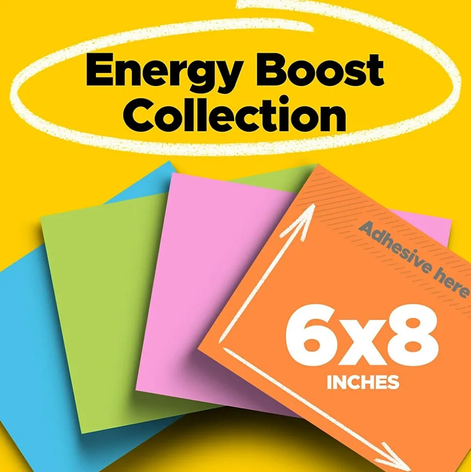 Uplift your spirits and messages via the vibrant, strong colors of the Energy Boost collection. Whether jotting down your daily to-do’s, brainstorming big ideas, studying or setting reminders, colors and ideas are always brighter together. These sticky notes feature 2X the sticking power. They also stick and re-stick – allowing you to move your notes with you throughout your day. They’re ideal for walls, doors, windows and other vertical surfaces, and like all Post-it Notes, they stick securely yet remove cleanly without damage. Keep your ideas across your notebooks, classroom books, calendars or other documents. No tape or tacks are needed with adhesive notes, saving you money and time on office products or school supplies. A great memo pad, these are ideal for using for notes or reminders to yourself or others. Post-it Super Sticky Notes are the perfect solution for shopping lists, reminders, notes on computer screens, time tracking, to-do lists, marking cables, color-coding documents, reminding kids to do chores, storyboarding, scratch paper and agile processing. This pack comes with 4 pads of 8 in. x 6 in. sticky notes. All pads are 45 sheets. These colorful sticky notes include colors from the Energy Boost collection including orange, green, blue and pink. All Post-it Notes are sourced from certified, renewable and responsibly managed forests, and all Post-it Notes are recyclable, so you can recycle them when they are no longer needed.