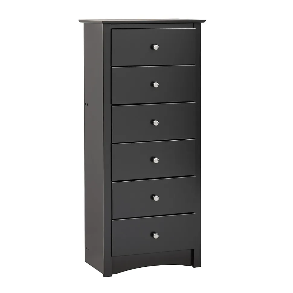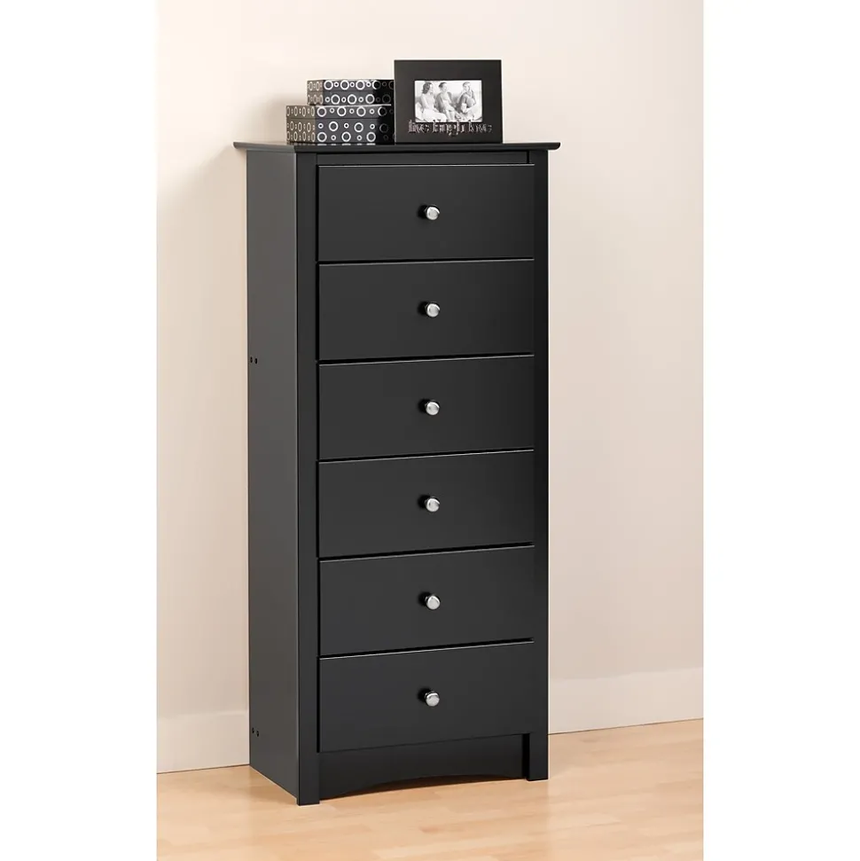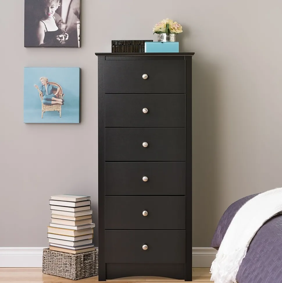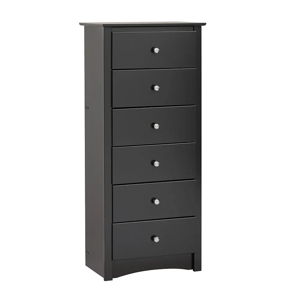 Prepac™ Sonom 6-Drawer chest in black finish is constructed from CARB-compliant laminated composite woods which give an elegant look to any room. Drawer chest has a sturdy top to pile on your books, cell phone, alarm clock, lamp and more.