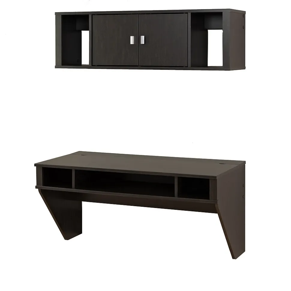 Optimize your space with Prepac’s Designer Floating Desk & Hutch. The combo is perfectly suited for any home office, den, living, room, kitchen or bedroom. The desk has a stable work surface that is ideal for any computer or simply as a place to get your work done.A rear “flip-up” door conceals a storage compartment that is ideal for power bars and adapters. No more messy wires cluttering up your workspace! The hutch provides lots of functional storage including two middle compartments with doors to tastefully conceal items as well as two open compartments to display books or small decorative items. Installation is a breeze with Prepac’s hanging rail system.Manufactured in Canada from non-toxic, laminated composite woods and meets all North American safety standards. Ships Ready to Assemble, includes an instruction booklet for easy assembly and has a 5-year manufacturer’s limited warranty.