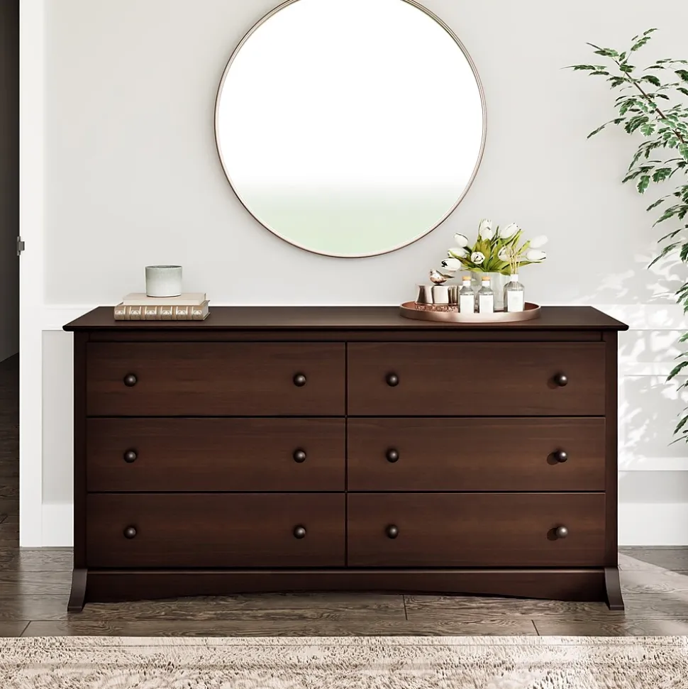 Prepac 6-Drawer dresser in espresso finish is constructed from CARB-compliant laminated composite woods which give an elegant look to any room. Drawer dresser has a sturdy top to pile on your books, cell phone, alarm clock, lamp and more.