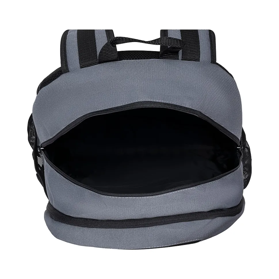 - This laptop backpack makes travel with electronics simple; made of textured poly, poly mesh, PP webbing and air mesh in gray and black